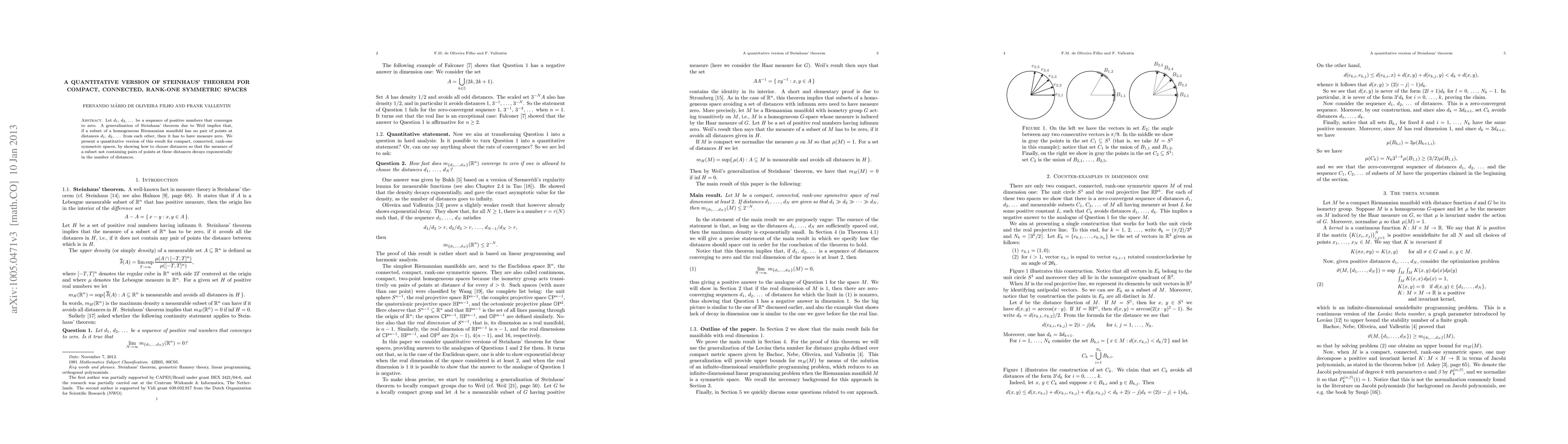 This paper presents a quantitative version of Steinhaus' theorem for compact, connected, rank-one symmetric spaces, demonstrating that the measure of subsets lacking pairs of points at specified distances decays exponentially with the number of such distances.