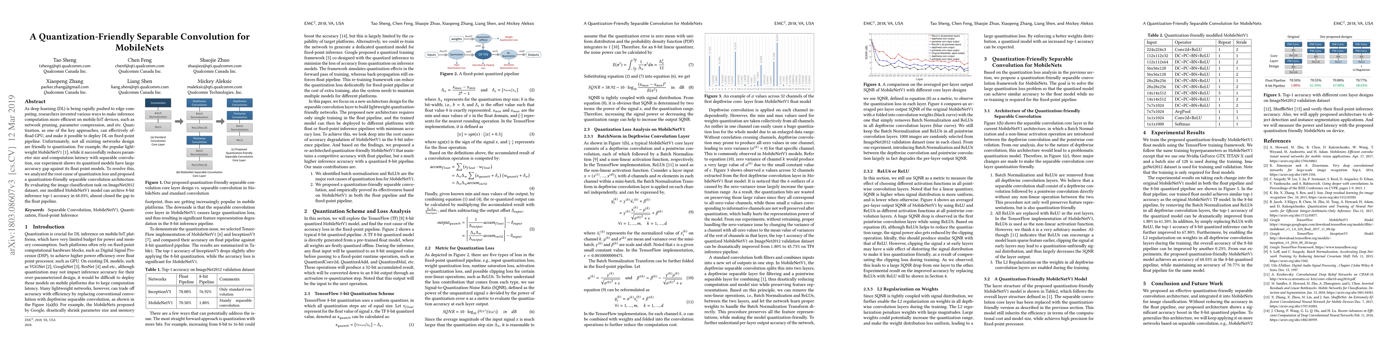 This paper proposes a quantization-friendly separable convolution architecture to improve the accuracy of quantized MobileNetV1 models. The modified model achieves 68.03% top-1 accuracy on ImageNet2012, significantly reducing the accuracy gap compared to its floating-point counterpart.
