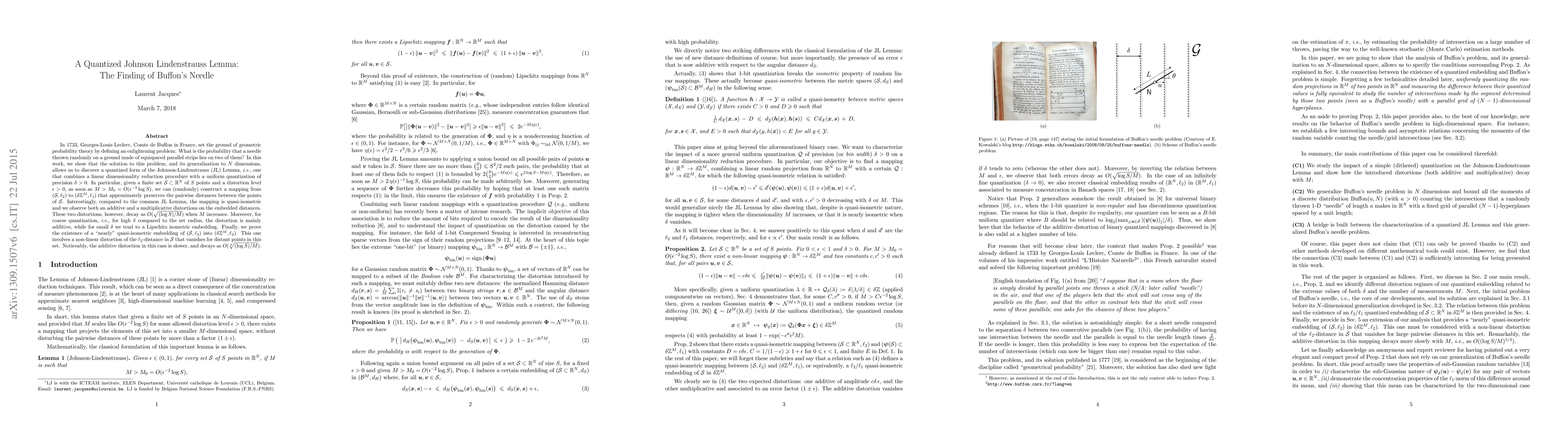 In 1733, Georges-Louis Leclerc, Comte de Buffon in France, set the ground of geometric probability theory by defining an enlightening problem: What is the probability that a needle thrown randomly on a ground made of equispaced parallel strips lies on two of them? In this work, we show that the solution to this problem, and its generalization to $N$ dimensions, allows us to discover a quantized form of the Johnson-Lindenstrauss (JL) Lemma, i.e., one that combines a linear dimensionality reduction procedure with a uniform quantization of precision $\delta>0$. In particular, given a finite set $\mathcal S \subset \mathbb R^N$ of $S$ points and a distortion level $\epsilon>0$, as soon as $M > M_0 = O(\epsilon^{-2} \log S)$, we can (randomly) construct a mapping from $(\mathcal S, \ell_2)$ to $(\delta\mathbb Z^M, \ell_1)$ that approximately preserves the pairwise distances between the points of $\mathcal S$. Interestingly, compared to the common JL Lemma, the mapping is quasi-isometric and we observe both an additive and a multiplicative distortions on the embedded distances. These two distortions, however, decay as $O(\sqrt{(\log S)/M})$ when $M$ increases. Moreover, for coarse quantization, i.e., for high $\delta$ compared to the set radius, the distortion is mainly additive, while for small $\delta$ we tend to a Lipschitz isometric embedding. Finally, we prove the existence of a "nearly" quasi-isometric embedding of $(\mathcal S, \ell_2)$ into $(\delta\mathbb Z^M, \ell_2)$. This one involves a non-linear distortion of the $\ell_2$-distance in $\mathcal S$ that vanishes for distant points in this set. Noticeably, the additive distortion in this case is slower, and decays as $O(\sqrt[4]{(\log S)/M})$.
