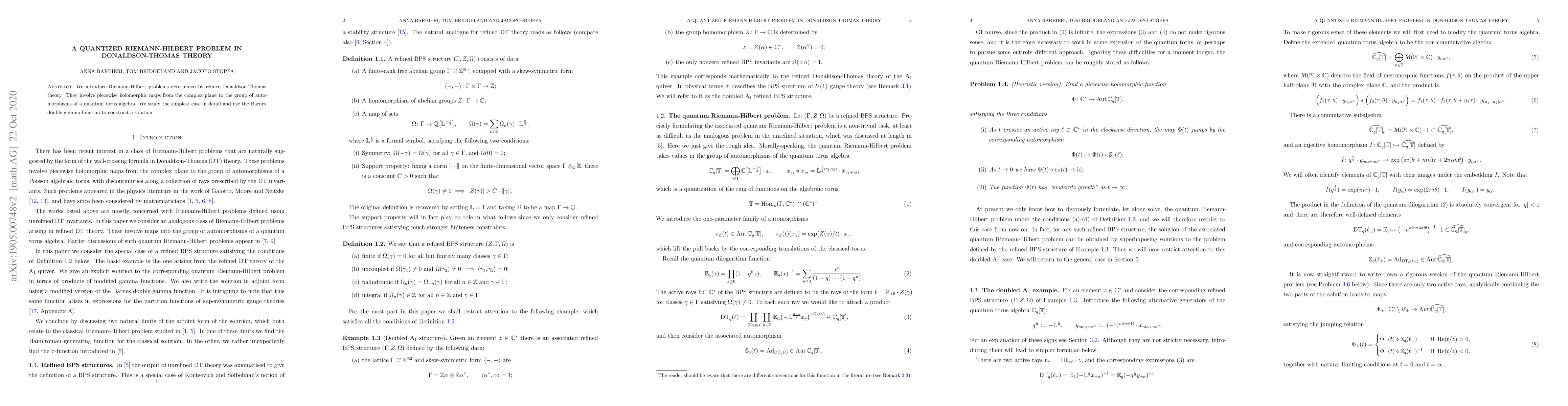 We introduce Riemann-Hilbert problems determined by refined Donaldson-Thomas theory. They involve piecewise holomorphic maps from the complex plane to the group of automorphisms of a quantum torus algebra. We study the simplest case in detail and use the Barnes double gamma function to construct a solution.