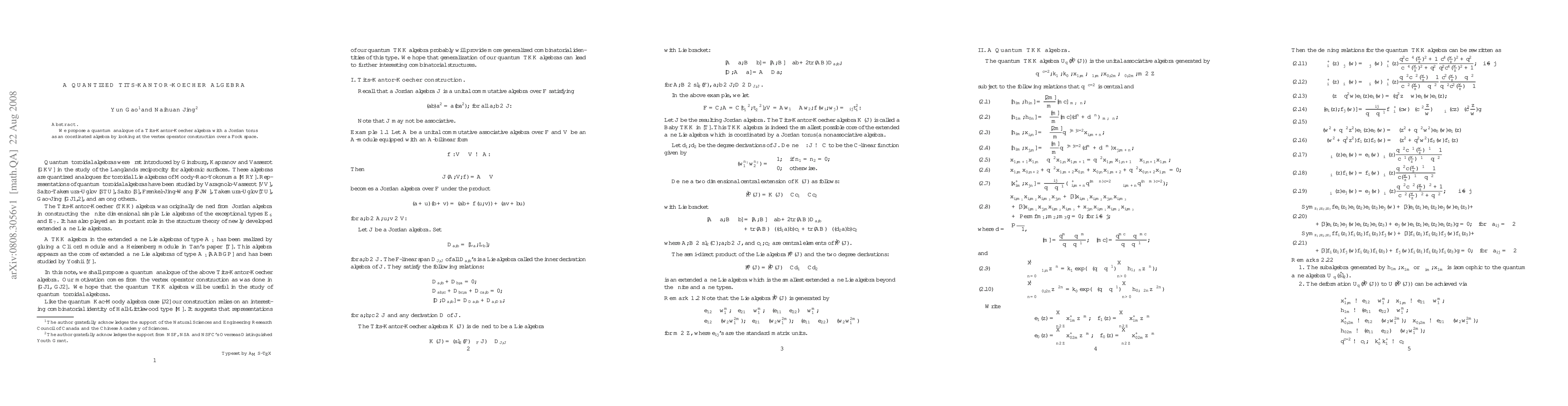 The research proposes a quantum analogue of a Tits-Kantor-Koecher (TKK) algebra using vertex operator construction over a Fock space, generating a unital associative algebra Uq(̂K(J)) with specific relations involving q±c/2, k±1, k±0, x±1, m, ψ±1,m, x±0,2m, and ψ±0,2m for m∈Z.