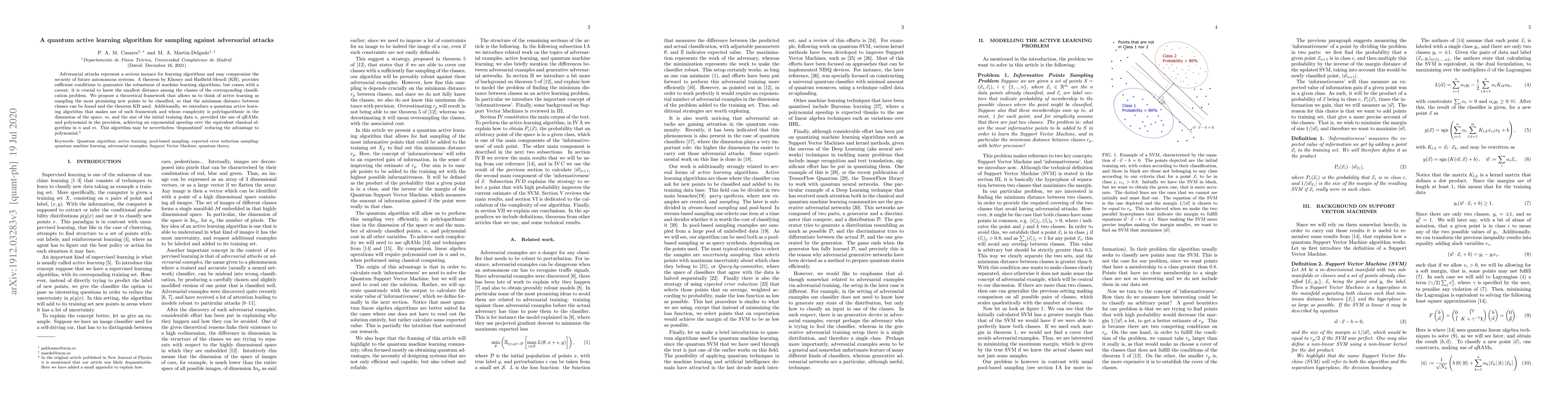 Adversarial attacks represent a serious menace for learning algorithms and may compromise the security of future autonomous systems. A theorem by Khoury and Hadfield-Menell (KH), provides sufficient conditions to guarantee the robustness of machine learning algorithms, but comes with a caveat: it is crucial to know the smallest distance among the classes of the corresponding classification problem. We propose a theoretical framework that allows us to think of active learning as sampling the most promising new points to be classified, so that the minimum distance between classes can be found and the theorem KH used. Additionally, we introduce a quantum active learning algorithm that makes use of such framework and whose complexity is polylogarithmic in the dimension of the space, $m$, and the size of the initial training data $n$, provided the use of qRAMs; and polynomial in the precision, achieving an exponential speedup over the equivalent classical algorithm in $n$ and $m$. This algorithm may be nevertheless `dequantized' reducing the advantage to polynomial.