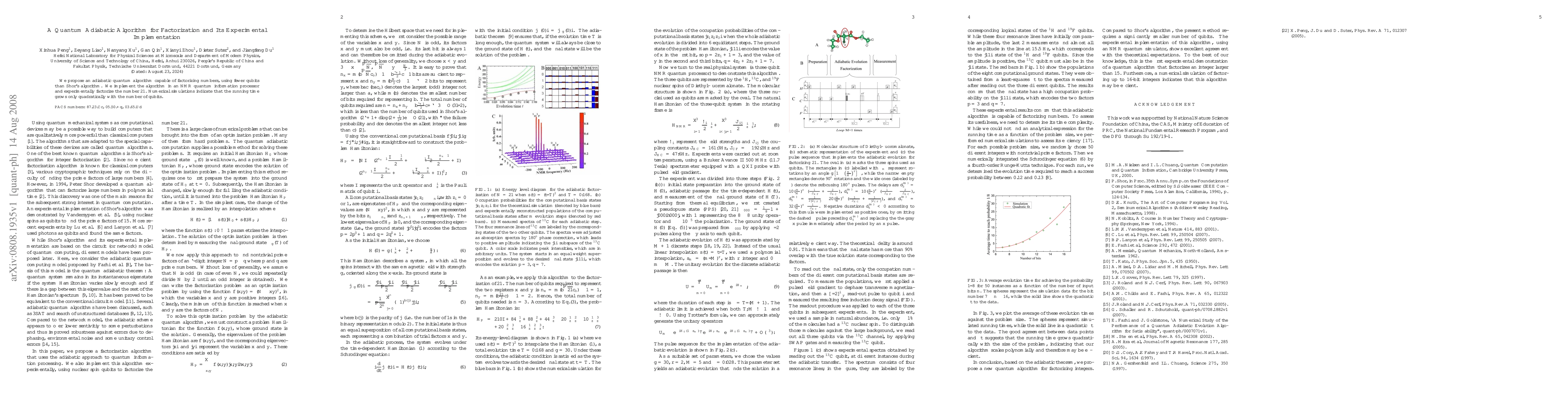 Summary: This paper introduces a novel adiabatic quantum algorithm for factorization that requires fewer qubits than Shor's algorithm, and demonstrates its implementation via NMR quantum information processing to factorize the number 21, with simulations showing a quadratic growth in running time.
