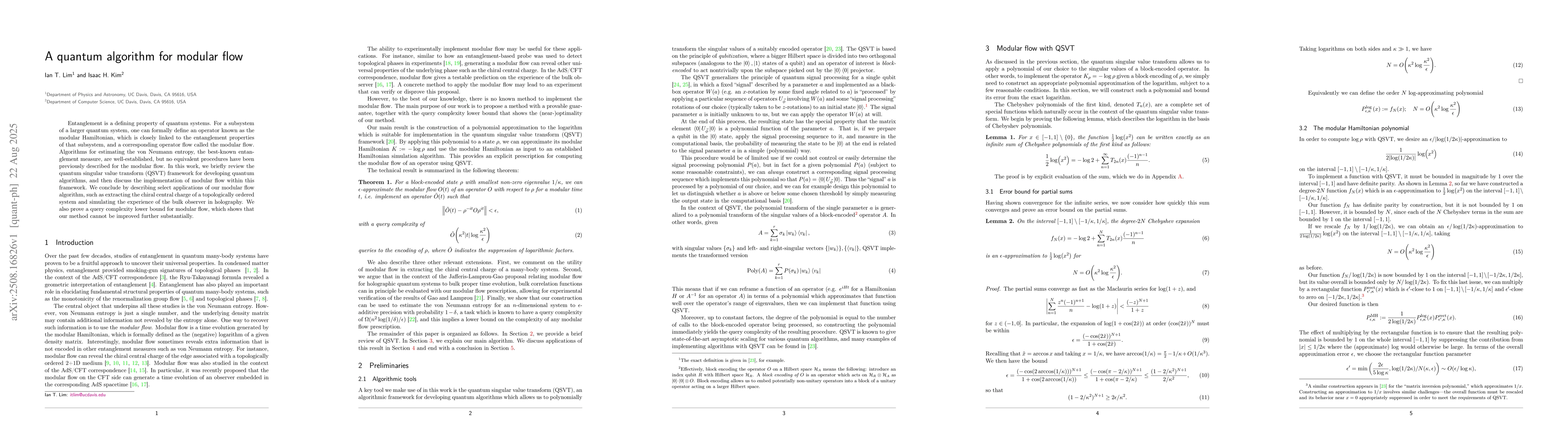Entanglement is a defining property of quantum systems. For a subsystem of a larger quantum system, one can formally define an operator known as the modular Hamiltonian, which is closely linked to the entanglement properties of that subsystem, and a corresponding operator flow called the modular flow. Algorithms for estimating the von Neumann entropy, the best-known entanglement measure, are well-established, but no equivalent procedures have been previously described for the modular flow. In this work, we briefly review the quantum singular value transform (QSVT) framework for developing quantum algorithms, and then discuss the implementation of modular flow within this framework. We conclude by describing select applications of our modular flow algorithm, such as extracting the chiral central charge of a topologically ordered system and simulating the experience of the bulk observer in holography. We also prove a query complexity lower bound for modular flow, which shows that our method cannot be improved further substantially.