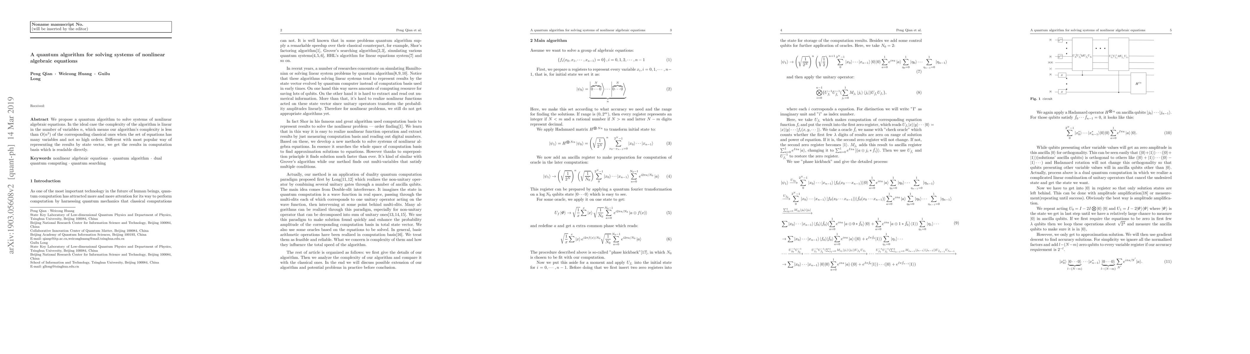 A quantum algorithm is proposed to solve systems of nonlinear algebraic equations with a complexity less than $O(n^{3})$, outperforming classical methods for large numbers of variables.