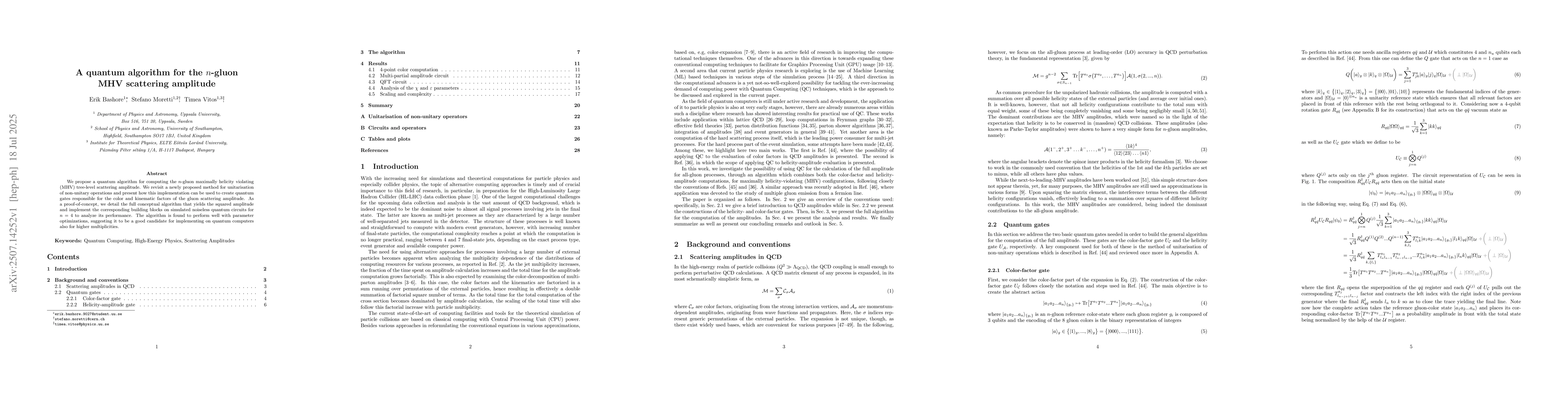 The paper presents a quantum algorithm for calculating n-gluon MHV scattering amplitudes, leveraging a novel unitarization method for non-unitary operations. The algorithm, tested for n=4, demonstrates promising performance on noiseless quantum circuits, suggesting potential for higher multiplicity implementations on real quantum computers.