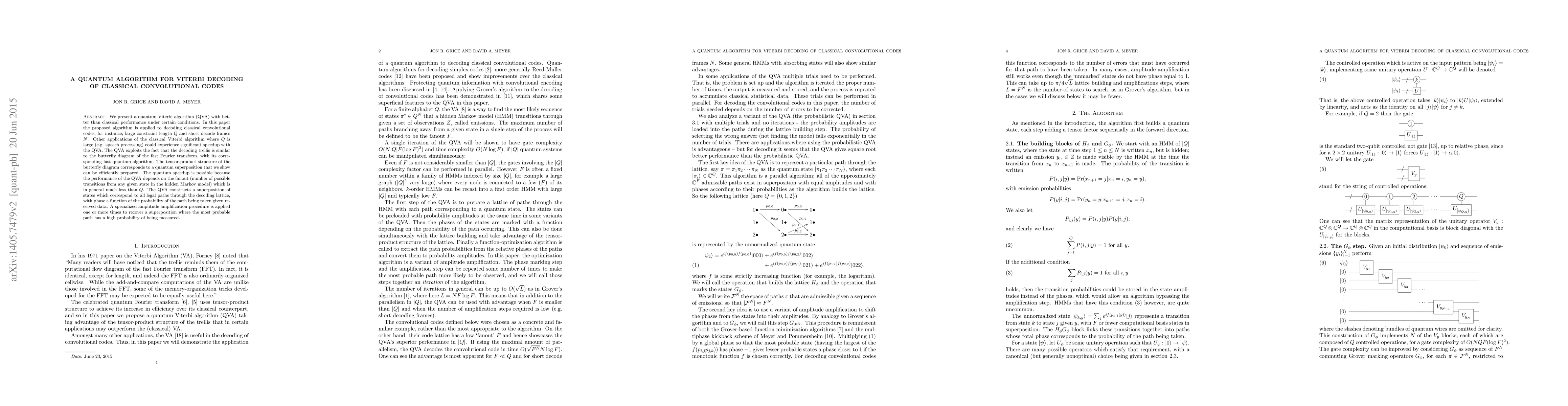 We present a quantum Viterbi algorithm (QVA) with better than classical performance under certain conditions. In this paper the proposed algorithm is applied to decoding classical convolutional codes, for instance; large constraint length $Q$ and short decode frames $N$. Other applications of the classical Viterbi algorithm where $Q$ is large (e.g. speech processing) could experience significant speedup with the QVA. The QVA exploits the fact that the decoding trellis is similar to the butterfly diagram of the fast Fourier transform, with its corresponding fast quantum algorithm. The tensor-product structure of the butterfly diagram corresponds to a quantum superposition that we show can be efficiently prepared. The quantum speedup is possible because the performance of the QVA depends on the fanout (number of possible transitions from any given state in the hidden Markov model) which is in general much less than $Q$. The QVA constructs a superposition of states which correspond to all legal paths through the decoding lattice, with phase a function of the probability of the path being taken given received data. A specialized amplitude amplification procedure is applied one or more times to recover a superposition where the most probable path has a high probability of being measured.