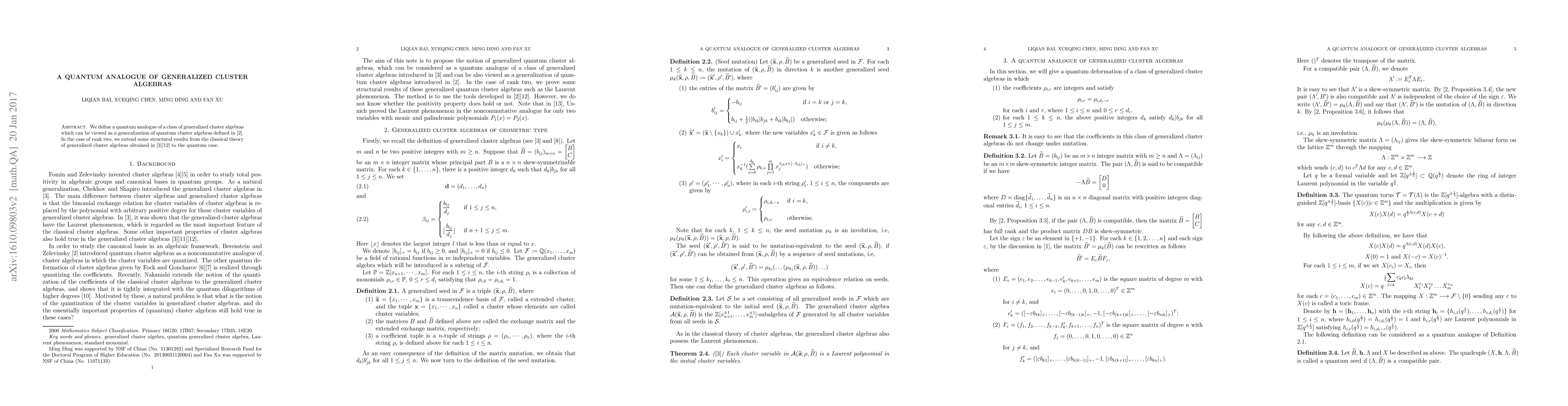 This paper introduces a quantum analogue of generalized cluster algebras, extending structural results from classical theory to the quantum setting, particularly focusing on rank two cases. The work generalizes previous quantum cluster algebra definitions and builds on classical structural findings from cited works.