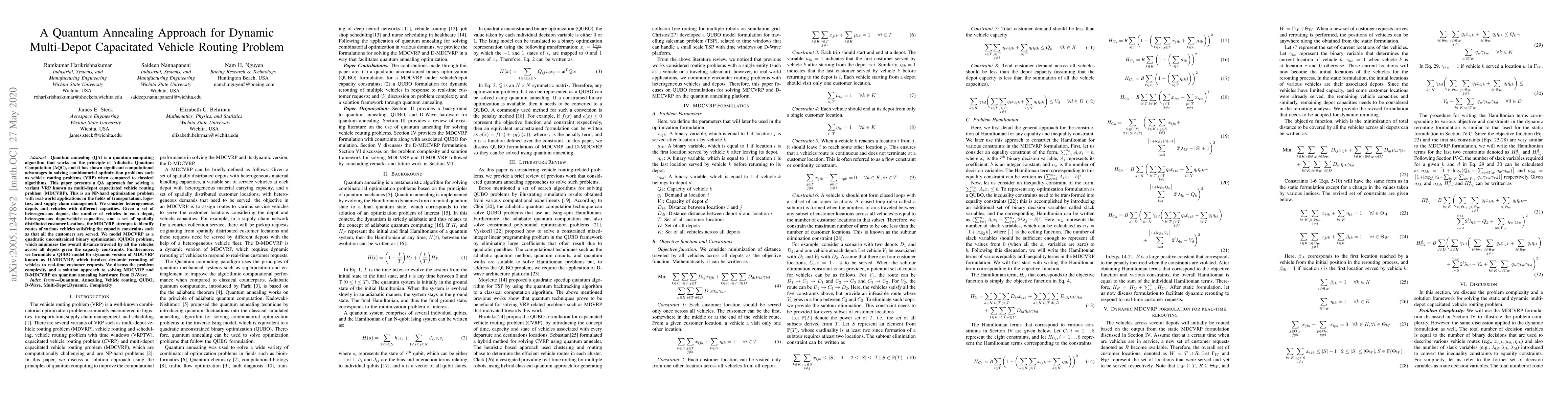 This paper explores a quantum annealing approach for solving the multi-depot capacitated vehicle routing problem (MDCVRP), an NP-hard optimization problem. It models the problem as a quadratic unconstrained binary optimization (QUBO) and discusses its dynamic version, D-MDCVRP, highlighting the computational advantages of quantum annealing over classical algorithms.