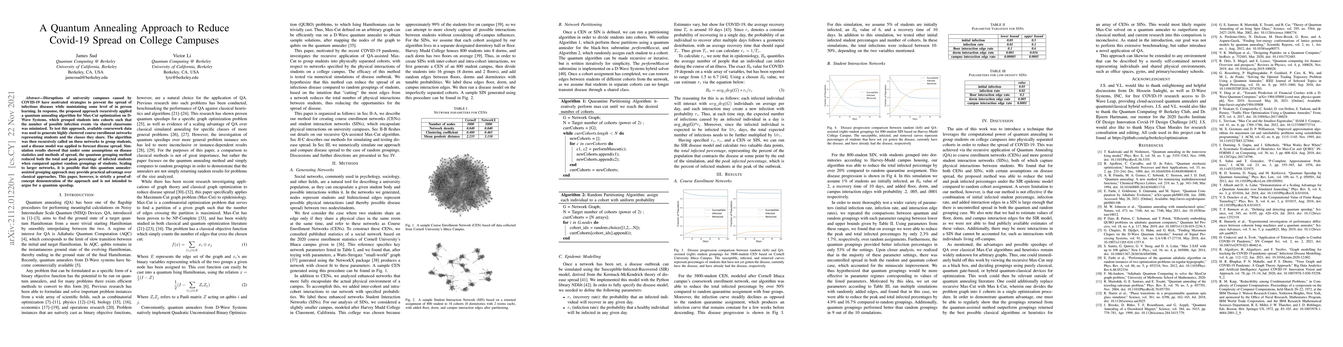 Disruptions of university campuses caused by COVID-19 have motivated strategies to prevent the spread of infectious diseases while maintaining some level of in person learning. In response, the proposed approach recursively applied a quantum annealing algorithm for Max-Cut optimization on D-Wave Systems, which grouped students into cohorts such that the number of possible infection events via shared classrooms was minimized. To test this approach, available coursework data was used to generate highly clustered course enrollment networks representing students and the classes they share. The algorithm was then recursively called on these networks to group students, and a disease model was applied to forecast disease spread. Simulation results showed that under some assumptions on disease statistics and methods of spread, the quantum grouping method reduced both the total and peak percentage of infected students when compared against random groupings of students. Scaling to larger networks, it is possible that this quantum annealer-assisted grouping approach may provide practical advantage over classical approaches. This paper, however, is strictly a proof-of-concept demonstration of the approach and is not intended to argue for a quantum speedup.