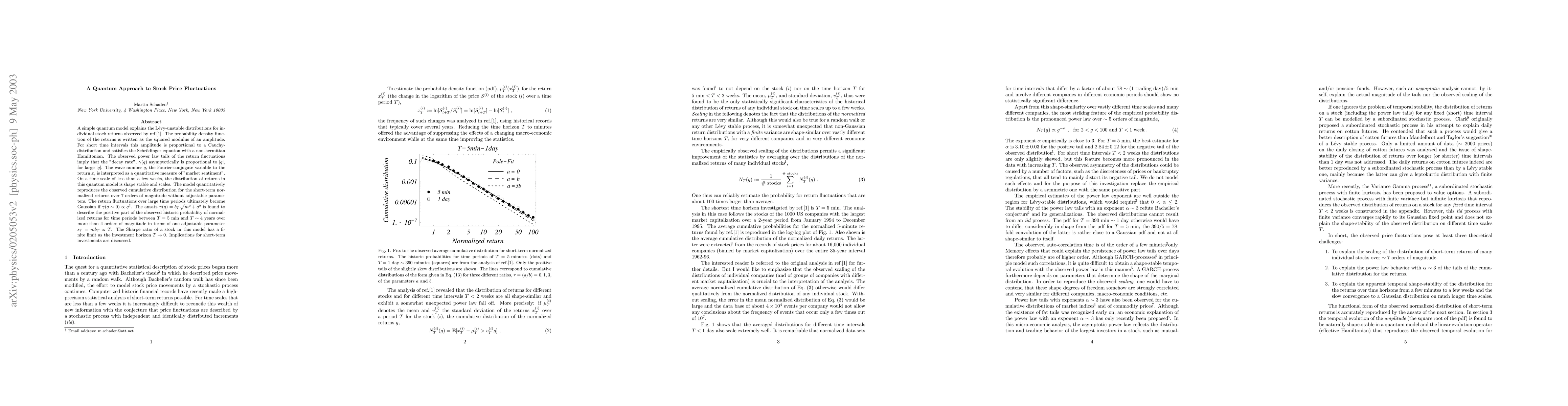 A simple quantum model explains the Levy-unstable distributions for individual stock returns observed by ref.[1]. The probability density function of the returns is written as the squared modulus of an amplitude. For short time intervals this amplitude is proportional to a Cauchy-distribution and satisfies the Schroedinger equation with a non-hermitian Hamiltonian. The observed power law tails of the return fluctuations imply that the "decay rate", $\gamma(q)$ asymptotically is proportional to $|q|$, for large $|q|$. The wave number, the Fourier-conjugate variable to the return, is interpreted as a quantitative measure of "market sentiment". On a time scale of less than a few weeks, the distribution of returns in this quantum model is shape stable and scales. The model quantitatively reproduces the observed cumulative distribution for the short-term normalized returns over 7 orders of magnitude without adjustable parameters. The return fluctuations over large time periods ultimately become Gaussian if $\gamma(q\sim 0)\propto q^2$. The ansatz $\gamma(q)=b_T\sqrt{m^2+q^2}$ is found to describe the positive part of the observed historic probability of normalized returns for time periods between T=5 min and $T\sim 4$ years over more than 4 orders of magnitude in terms of one adjustable parameter $s_T=m b_T\propto T$. The Sharpe ratio of a stock in this model has a finite limit as the investment horizon $T\to 0$. Implications for short-term investments are discussed.