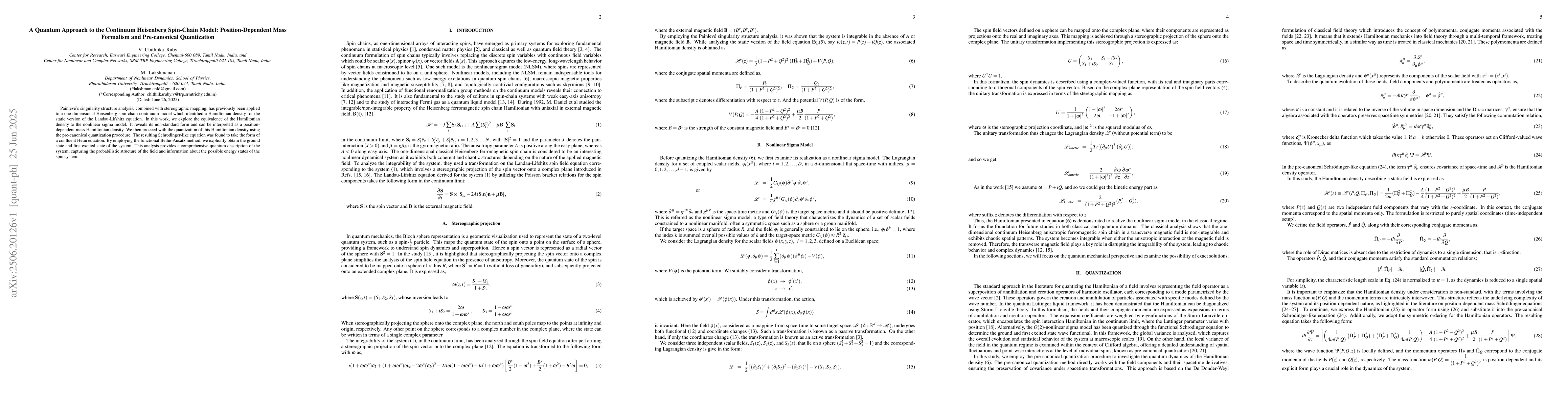 Painlev\'{e}'s singularity structure analysis, combined with stereographic mapping, has previously been applied to a one-dimensional Heisenberg spin-chain continuum model which identified a Hamiltonian density for the static version of the Landau-Lifshitz equation. In this work, we explore the equivalence of the Hamiltonian density to the nonlinear sigma model. It reveals its non-standard form and can be interpreted as a position-dependent mass Hamiltonian density. We then proceed with the quantization of this Hamiltonian density using the pre-canonical quantization procedure. The resulting Schr\"{o}dinger-like equation was found to take the form of a confluent Heun equation. By employing the functional Bethe-Ansatz method, we explicitly obtain the ground state and first excited state of the system. This analysis provides a comprehensive quantum description of the system, capturing the probabilistic structure of the field and information about the possible energy states of the spin system.