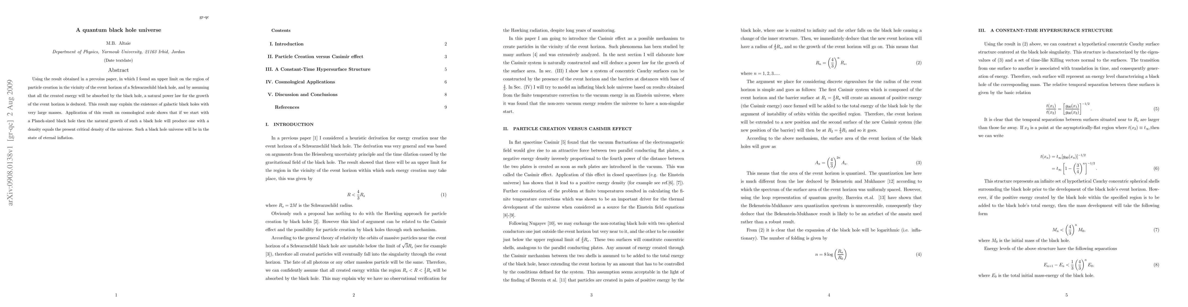 Using the result obtained in a prevoius paper, in which I found an upper limit on the region of particle creation in the vicinity of the event horizon of a Schwarzschild black hole, and by assuming that all the created energy will be absorbed by the black hole, a natural power law for the growth of the event horizon is deduced. This result may explain the existence of galactic black holes with very large masses. Application of this result on cosmological scale shows that if we start with a Planck-sized black hole then the natural growth of such a black hole will produce one with a density equals the present critical density of the universe. Such a black hole universe will be in the state of eternal inflation.