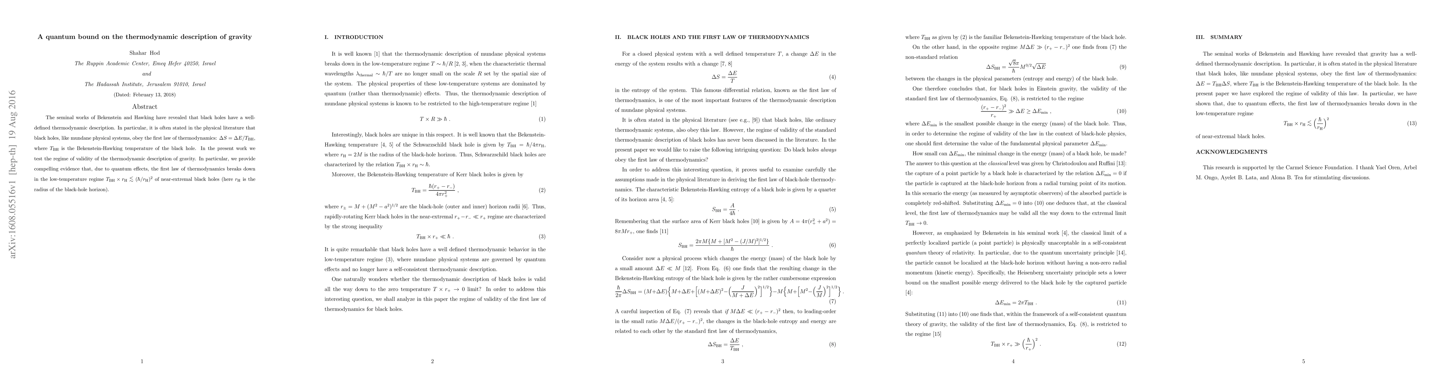 This paper investigates the thermodynamic description of gravity, particularly focusing on the first law of thermodynamics for black holes. It finds that quantum effects cause the first law to break down in the low-temperature regime of near-extremal black holes, challenging the traditional thermodynamic view.