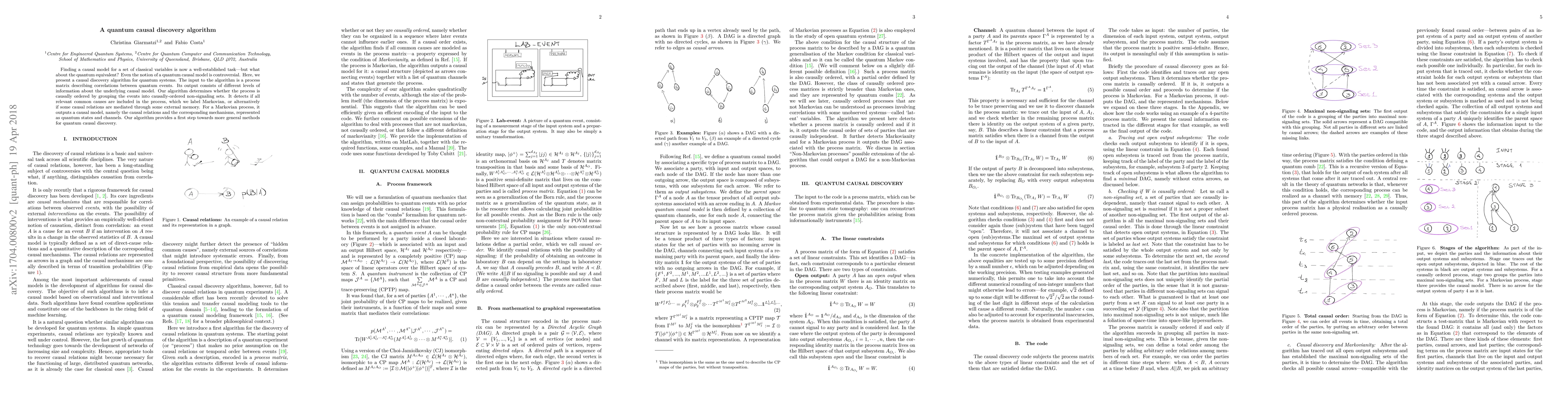 Finding a causal model for a set of classical variables is now a well-established task---but what about the quantum equivalent? Even the notion of a quantum causal model is controversial. Here, we present a causal discovery algorithm for quantum systems. The input to the algorithm is a process matrix describing correlations between quantum events. Its output consists of different levels of information about the underlying causal model. Our algorithm determines whether the process is causally ordered by grouping the events into causally-ordered non-signaling sets. It detects if all relevant common causes are included in the process, which we label Markovian, or alternatively if some causal relations are mediated through some external memory. For a Markovian process, it outputs a causal model, namely the causal relations and the corresponding mechanisms, represented as quantum states and channels. Our algorithm provides a first step towards more general methods for quantum causal discovery.