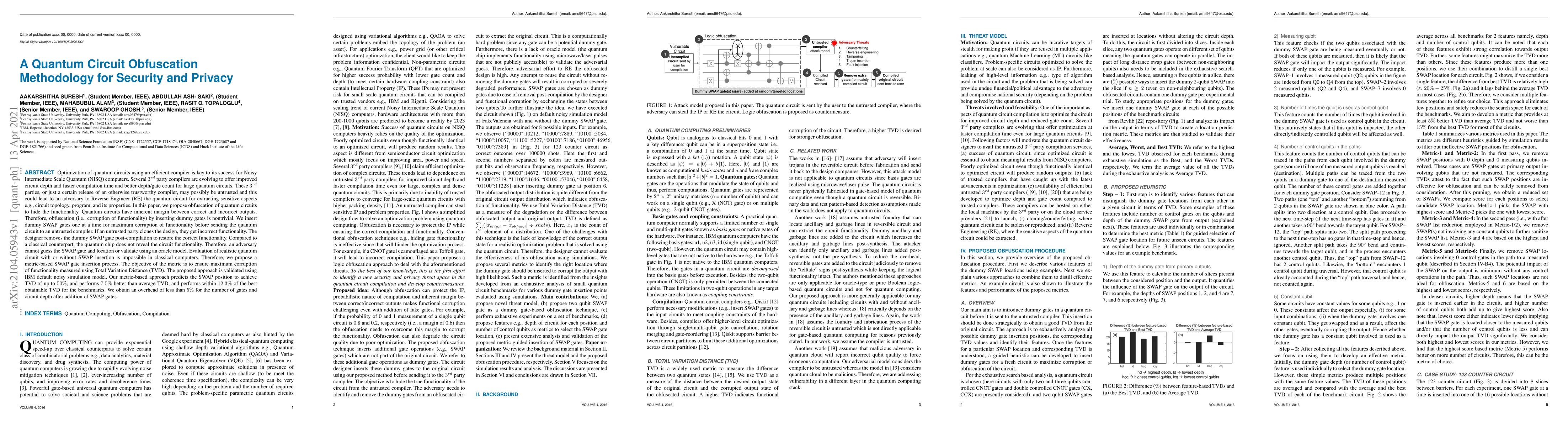 This paper proposes a quantum circuit obfuscation methodology to protect against reverse engineering by untrusted compilers. It introduces a method of inserting dummy SWAP gates to corrupt the functionality, ensuring that an adversary cannot deduce the original circuit's functionality, validated with an IBM noisy simulation model, achieving a TVD of up to 50% with minimal overhead.