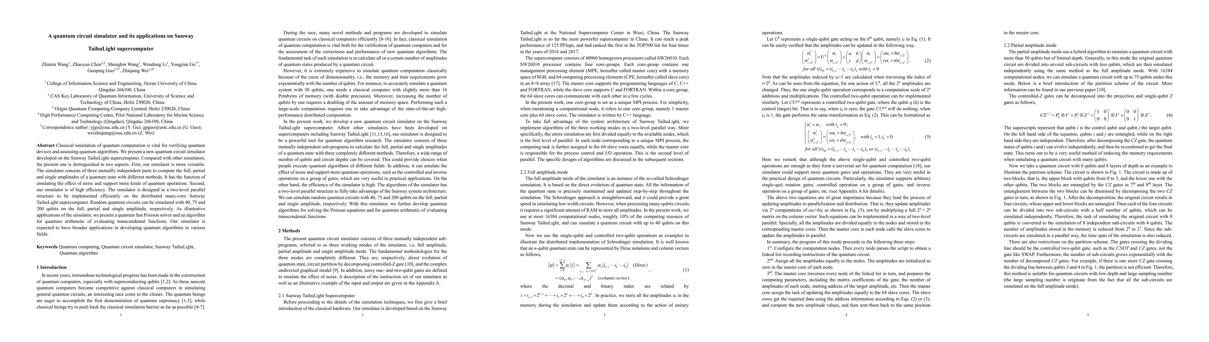 This paper introduces a versatile quantum circuit simulator developed on the Sunway TaihuLight supercomputer, featuring three independent parts for computing different quantum amplitudes and supporting noise emulation. The simulator's high efficiency, achieved through a two-level parallel structure, enables simulations of up to 200 qubits, and it demonstrates applications in quantum fast Poisson solving and quantum arithmetic.