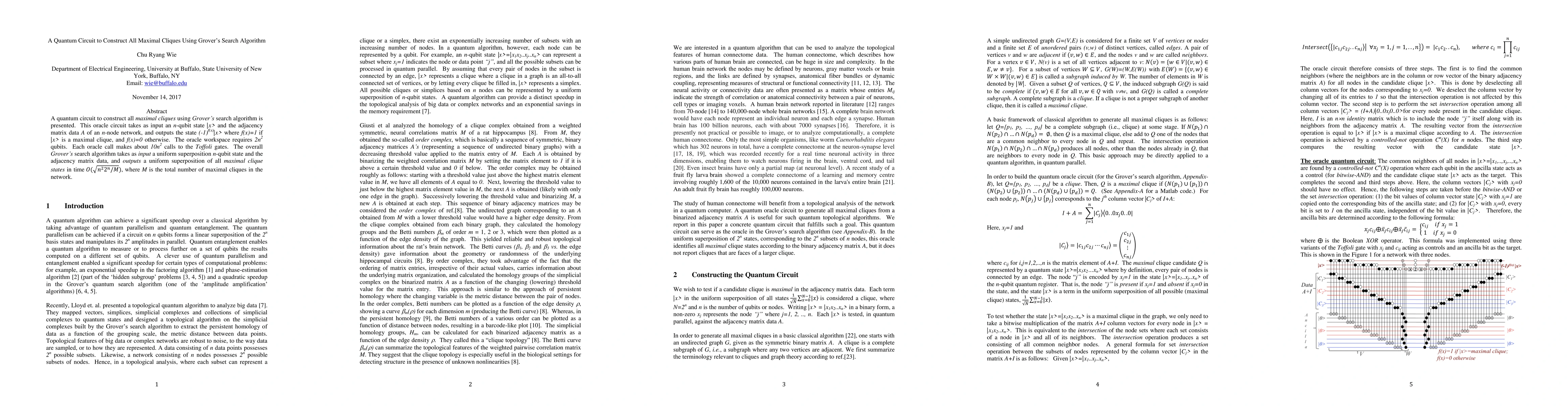 This paper presents a quantum circuit utilizing Grover's search algorithm to identify all maximal cliques in a network. The oracle circuit processes an n-qubit state and adjacency matrix data, outputting states corresponding to maximal cliques, requiring 2n^2 qubits and approximately 10n^2 Toffoli gate calls per oracle call.