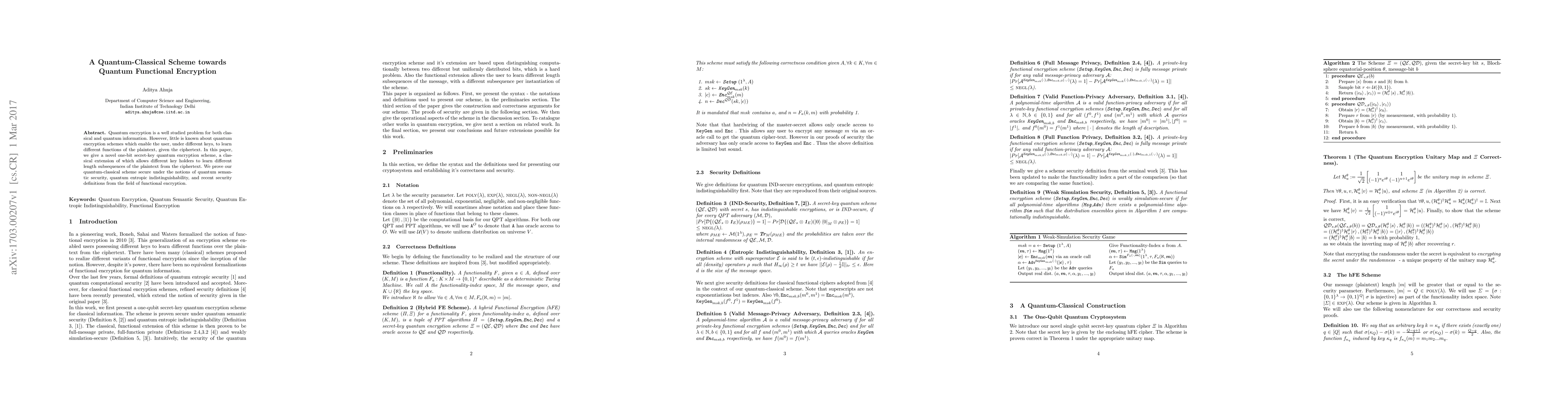 Quantum encryption is a well studied problem for both classical and quantum information. However, little is known about quantum encryption schemes which enable the user, under different keys, to learn different functions of the plaintext, given the ciphertext. In this paper, we give a novel one-bit secret-key quantum encryption scheme, a classical extension of which allows different key holders to learn different length subsequences of the plaintext from the ciphertext. We prove our quantum-classical scheme secure under the notions of quantum semantic security, quantum entropic indistinguishability, and recent security definitions from the field of functional encryption.