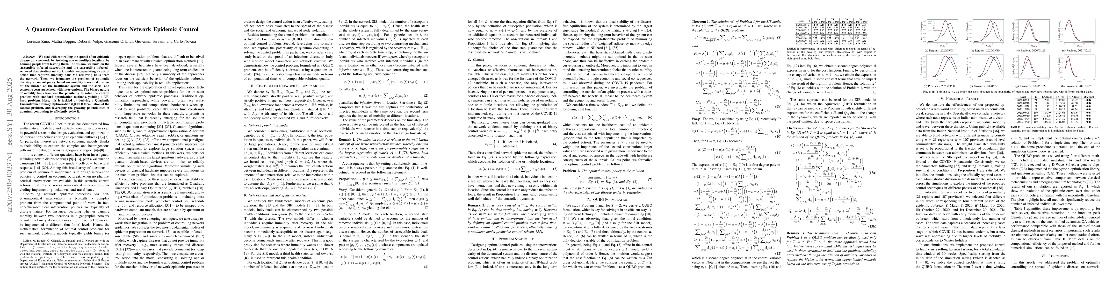 We deal with controlling the spread of an epidemic disease on a network by isolating one or multiple locations by banning people from leaving them. To this aim, we build on the susceptible-infected-susceptible and the susceptible-infected-removed discrete-time network models, encapsulating a control action that captures mobility bans via removing links from the network. Then, we formulate the problem of optimally devising a control policy based on mobility bans that trades-off the burden on the healthcare system and the social and economic costs associated with interventions. The binary nature of mobility bans hampers the possibility to solve the control problem with standard optimization methods, yielding a NP-hard problem. Here, this is tackled by deriving a Quadratic Unconstrained Binary Optimization (QUBO) formulation of the control problem, and leveraging the growing potentialities of quantum computing to efficiently solve it.