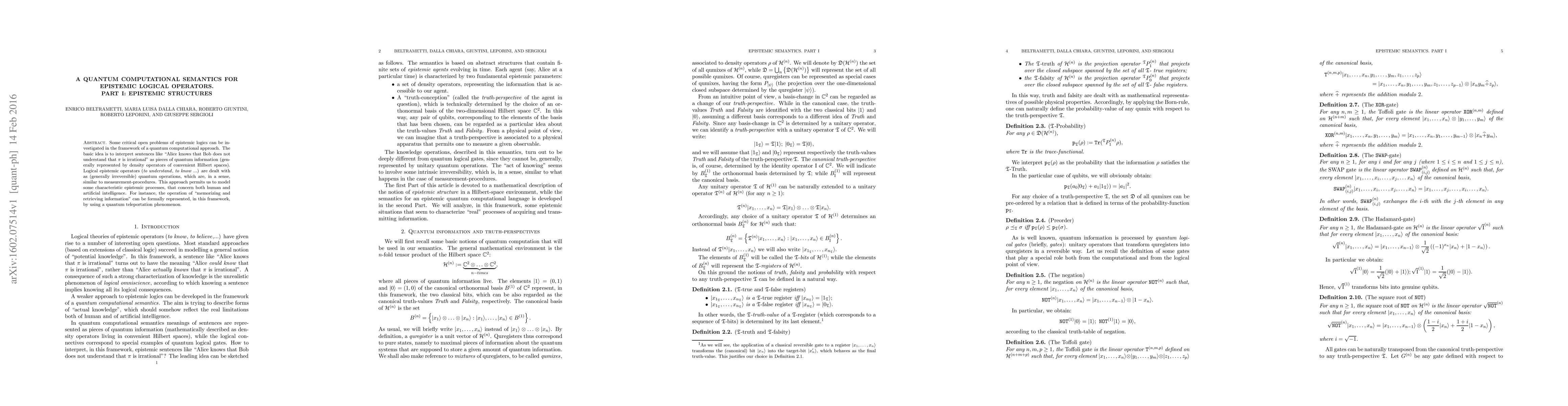 Some critical open problems of epistemic logics can be investigated in the framework of a quantum computational approach. The basic idea is to interpret sentences - like Alice knows that Bob does not understand that Pi is irrational - as pieces of quantum information (generally represented by density operators of convenient Hilbert spaces). Logical epistemic operators (to understand, to know ...) are dealt with as (generally irreversible) quantum operations, which are, in a sense, similar to measurement-procedures. This approach permits us to model some characteristic epistemic processes, that concern both human and artificial intelligence. For instance, the operation of \memorizing and retrieving information" can be formally represented, in this framework, by using a quantum teleportation phenomenon.