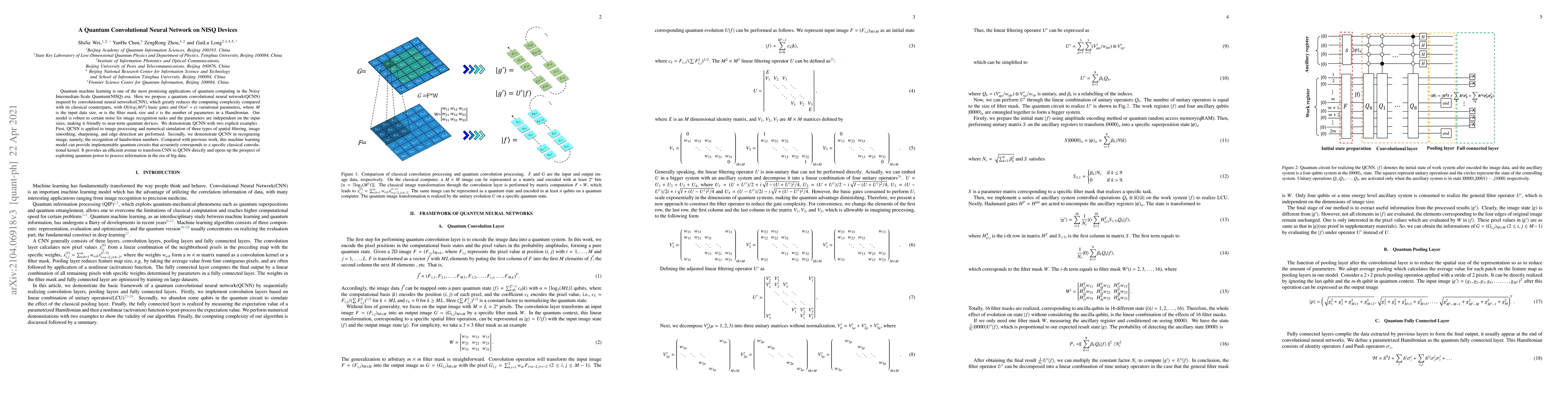Quantum machine learning is one of the most promising applications of quantum computing in the Noisy Intermediate-Scale Quantum(NISQ) era. Here we propose a quantum convolutional neural network(QCNN) inspired by convolutional neural networks(CNN), which greatly reduces the computing complexity compared with its classical counterparts, with $O((log_{2}M)^6) $ basic gates and $O(m^2+e)$ variational parameters, where $M$ is the input data size, $m$ is the filter mask size and $e$ is the number of parameters in a Hamiltonian. Our model is robust to certain noise for image recognition tasks and the parameters are independent on the input sizes, making it friendly to near-term quantum devices. We demonstrate QCNN with two explicit examples. First, QCNN is applied to image processing and numerical simulation of three types of spatial filtering, image smoothing, sharpening, and edge detection are performed. Secondly, we demonstrate QCNN in recognizing image, namely, the recognition of handwritten numbers. Compared with previous work, this machine learning model can provide implementable quantum circuits that accurately corresponds to a specific classical convolutional kernel. It provides an efficient avenue to transform CNN to QCNN directly and opens up the prospect of exploiting quantum power to process information in the era of big data.