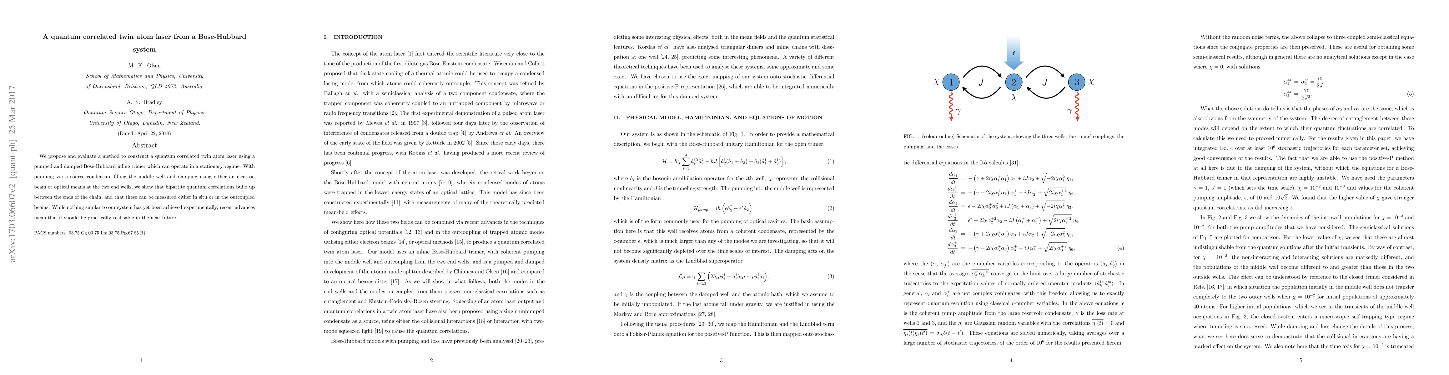We propose and evaluate a method to construct a quantum correlated twin atom laser using a pumped and damped Bose-Hubbard inline trimer which can operate in a stationary regime. With pumping via a source condensate filling the middle well and damping using either an electron beam or optical means at the two end wells, we show that bipartite quantum correlations build up between the ends of the chain, and that these can be measured either in situ or in the outcoupled beams. While nothing similar to our system has yet been achieved experimentally, recent advances mean that it should be practically realisable in the near future.