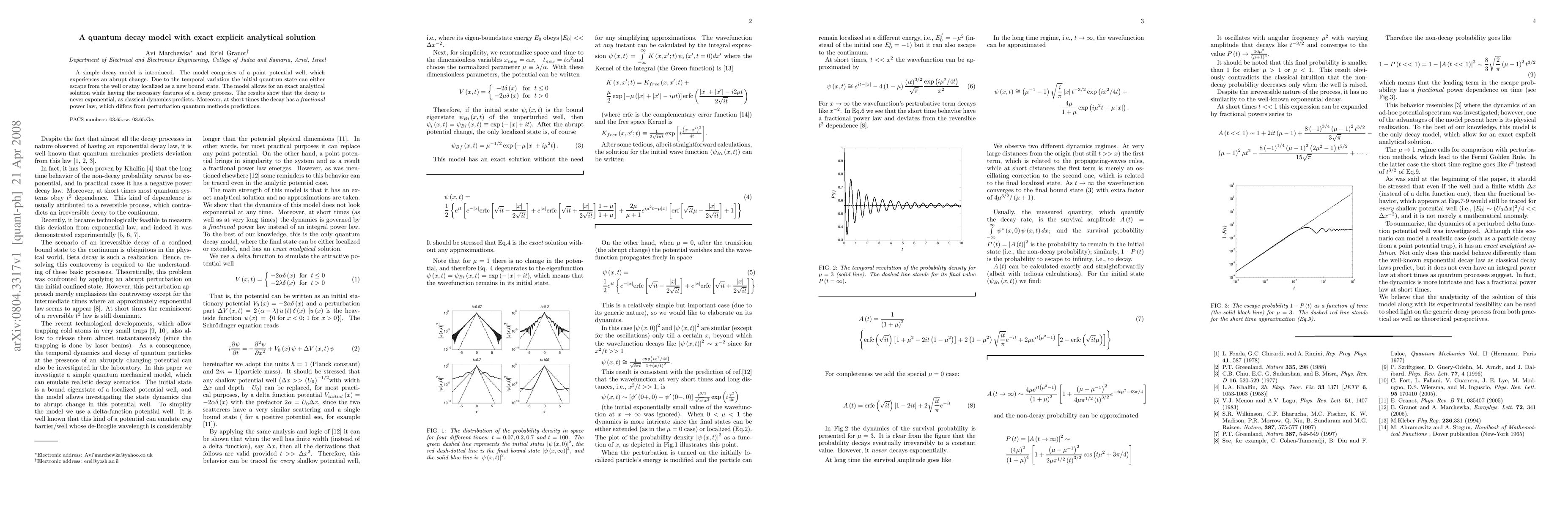 A simple decay model is introduced. The model comprises of a point potential well, which experiences an abrupt change. Due to the temporal variation the initial quantum state can either escape from the well or stay localized as a new bound state. The model allows for an exact analytical solution while having the necessary features of a decay process. The results show that the decay is never exponential, as classical dynamics predicts. Moreover, at short times the decay has a \textit{fractional} power law, which differs from perturbation quantum methods predictions.