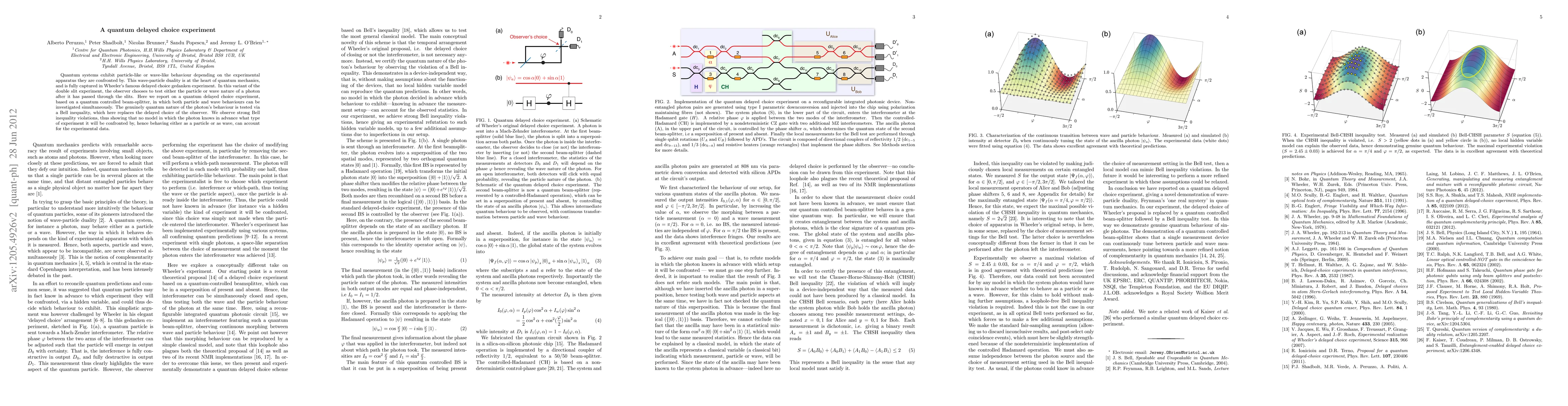 This paper reports on a quantum delayed choice experiment using a quantum controlled beam-splitter, demonstrating simultaneous particle and wave behaviours of photons. The experiment's quantum nature is confirmed by strong violations of Bell inequalities, indicating that photons do not predetermine their behaviour based on future experimental conditions.