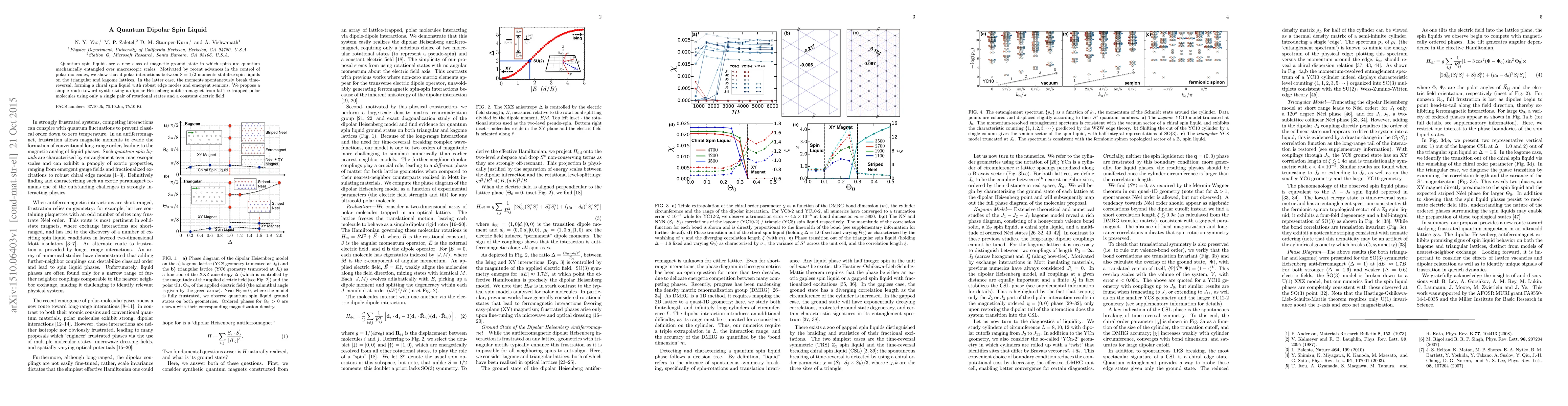 Quantum spin liquids are a new class of magnetic ground state in which spins are quantum mechanically entangled over macroscopic scales. Motivated by recent advances in the control of polar molecules, we show that dipolar interactions between S=1/2 moments stabilize spin liquids on the triangular and kagome lattices. In the latter case, the moments spontaneously break time-reversal, forming a chiral spin liquid with robust edge modes and emergent semions. We propose a simple route toward synthesizing a dipolar Heisenberg antiferromagnet from lattice-trapped polar molecules using only a single pair of rotational states and a constant electric field.