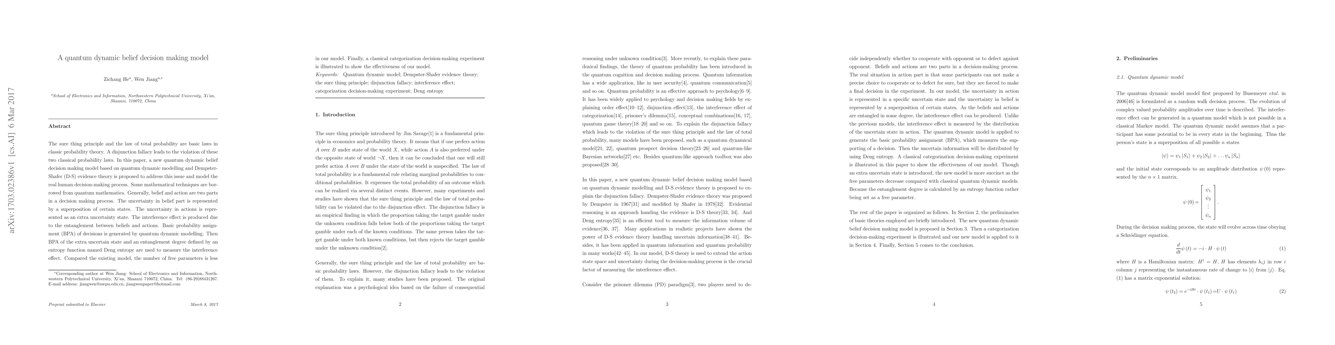 This paper proposes a quantum dynamic belief decision making model that integrates quantum dynamic modelling and Dempster-Shafer evidence theory to address the disjunction fallacy in classical probability. It uses quantum mathematics to represent uncertainty in beliefs and actions, and measures interference effects through an entanglement degree based on Deng entropy.