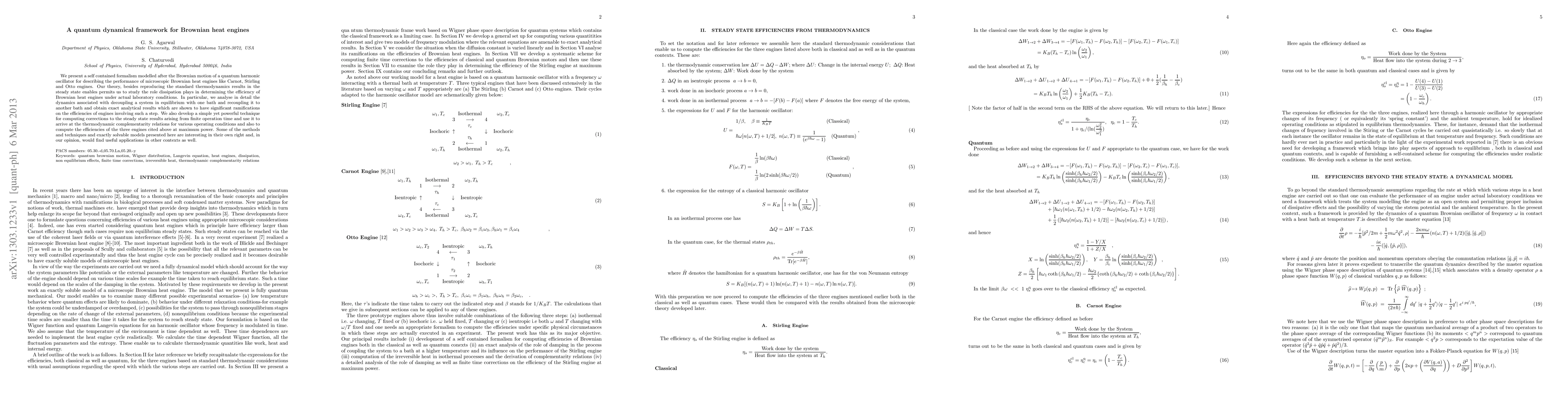 This paper introduces a quantum dynamical framework for analyzing microscopic Brownian heat engines, including Carnot, Stirling, and Otto engines, and explores the efficiency impacts of dissipation under laboratory conditions. It provides exact analytical results for decoupling and recoupling processes and develops a method for computing corrections due to finite operation time, leading to thermodynamic complementarity relations and maximum power efficiency computations.