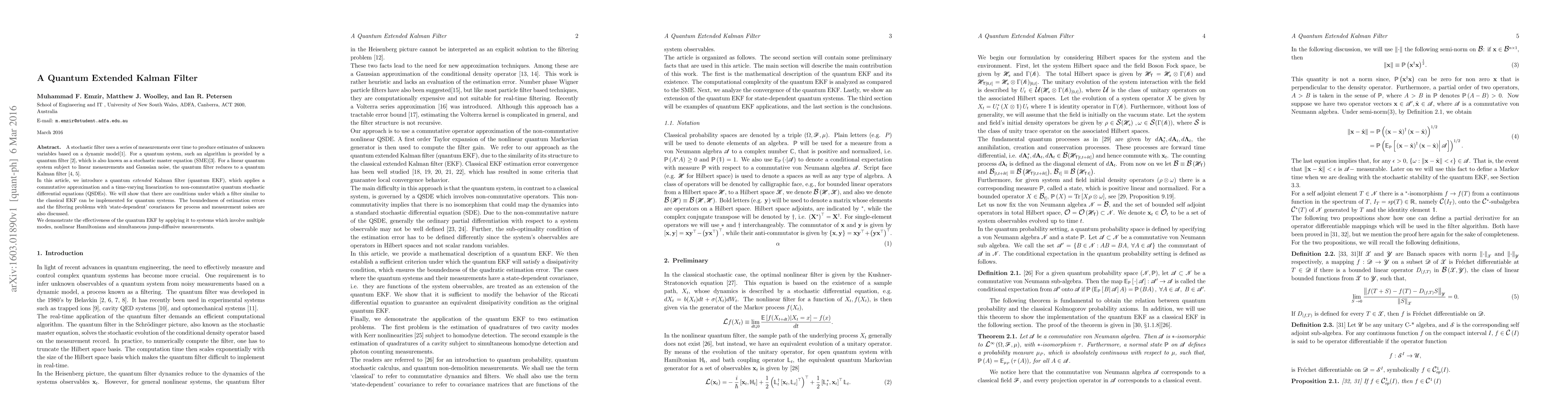 The paper introduces a quantum extended Kalman filter (quantum EKF) for estimating unknown variables in a dynamic quantum system, utilizing a commutative approximation and time-varying linearization for non-commutative quantum stochastic differential equations (QSDEs).