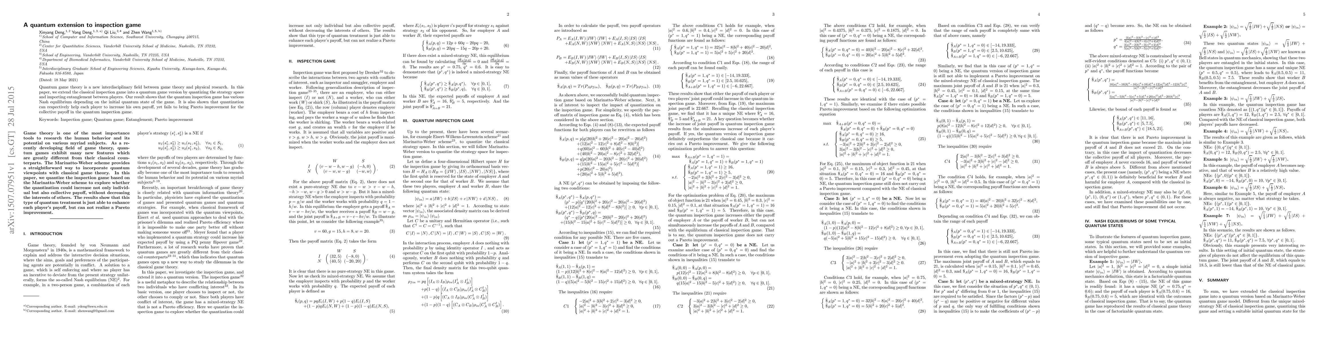 This paper extends the classical inspection game into a quantum version, introducing quantum entanglement and a quantized strategy space. The study finds that the quantum game has multiple Nash equilibria based on the initial quantum state, and while it can enhance individual payoffs, it does not lead to a Pareto improvement for the collective payoff.