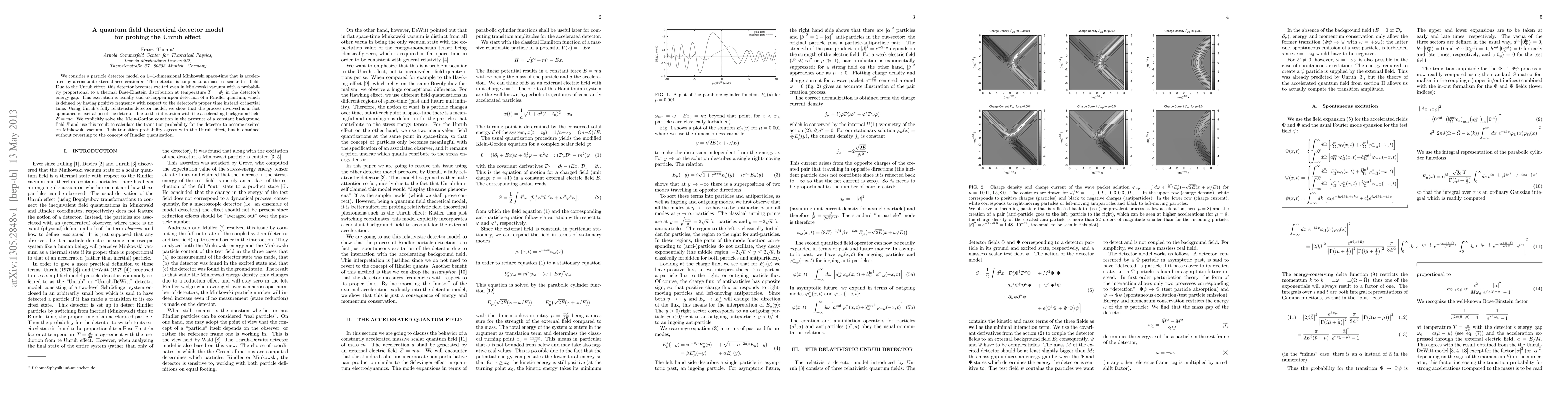 We consider a particle detector model on 1+1-dimensional Minkowski space-time that is accelerated by a constant external acceleration a. The detector is coupled to a massless scalar test field. Due to the Unruh effect, this detector becomes excited even in Minkowski vacuum with a probability proportional to a thermal Bose-Einstein distribution at temperature T=a/2pi in the detector's energy gap. This excitation is usually said to happen upon detection of a Rindler quantum, which is defined by having positive frequency with respect to the detector's proper time instead of inertial time. Using Unruh's fully relativistic detector model, we show that the process involved is in fact spontaneous excitation of the detector due to the interaction with the accelerating background field E=ma. We explicitly solve the Klein-Gordon equation in the presence of a constant background field E and use this result to calculate the transition probability for the detector to become excited on Minkowski vacuum. This transition probability agrees with the Unruh effect, but is obtained without reverting to the concept of Rindler quantization.