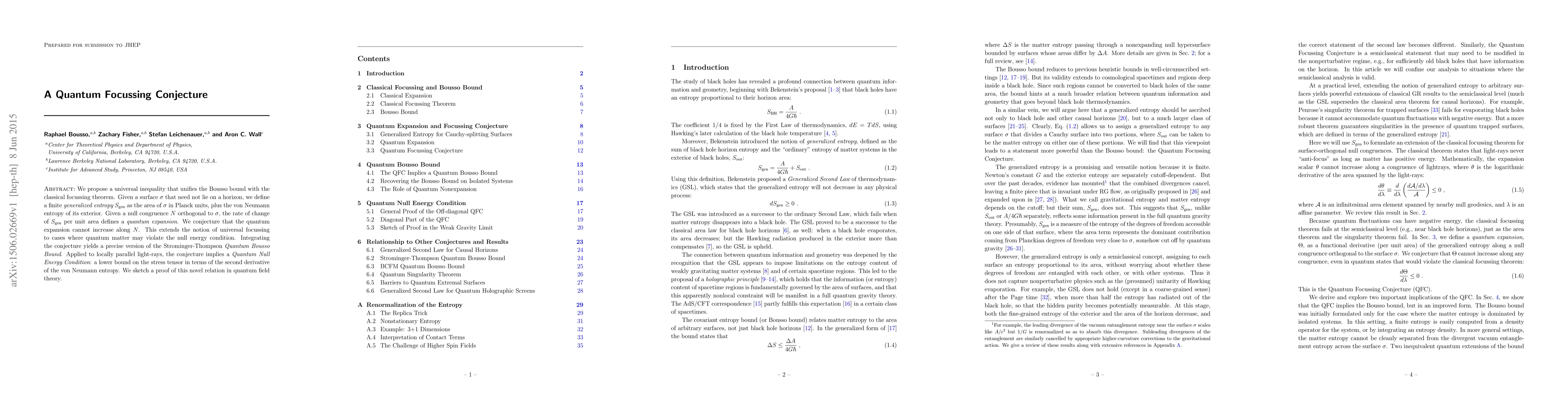 We propose a universal inequality that unifies the Bousso bound with the classical focussing theorem. Given a surface $\sigma$ that need not lie on a horizon, we define a finite generalized entropy $S_\text{gen}$ as the area of $\sigma$ in Planck units, plus the von Neumann entropy of its exterior. Given a null congruence $N$ orthogonal to $\sigma$, the rate of change of $S_\text{gen}$ per unit area defines a quantum expansion. We conjecture that the quantum expansion cannot increase along $N$. This extends the notion of universal focussing to cases where quantum matter may violate the null energy condition. Integrating the conjecture yields a precise version of the Strominger-Thompson Quantum Bousso Bound. Applied to locally parallel light-rays, the conjecture implies a Quantum Null Energy Condition: a lower bound on the stress tensor in terms of the second derivative of the von Neumann entropy. We sketch a proof of this novel relation in quantum field theory.