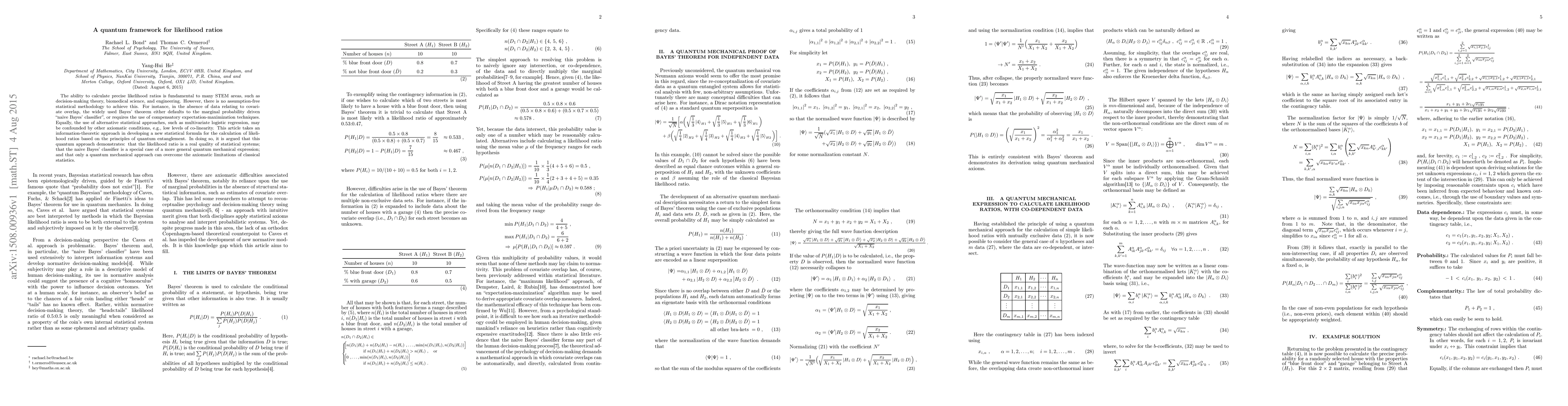 The ability to calculate precise likelihood ratios is fundamental to many STEM areas, such as decision-making theory, biomedical science, and engineering. However, there is no assumption-free statistical methodology to achieve this. For instance, in the absence of data relating to covariate overlap, the widely used Bayes' theorem either defaults to the marginal probability driven "naive Bayes' classifier", or requires the use of compensatory expectation-maximization techniques. Equally, the use of alternative statistical approaches, such as multivariate logistic regression, may be confounded by other axiomatic conditions, e.g., low levels of co-linearity. This article takes an information-theoretic approach in developing a new statistical formula for the calculation of likelihood ratios based on the principles of quantum entanglement. In doing so, it is argued that this quantum approach demonstrates: that the likelihood ratio is a real quality of statistical systems; that the naive Bayes' classifier is a special case of a more general quantum mechanical expression; and that only a quantum mechanical approach can overcome the axiomatic limitations of classical statistics.