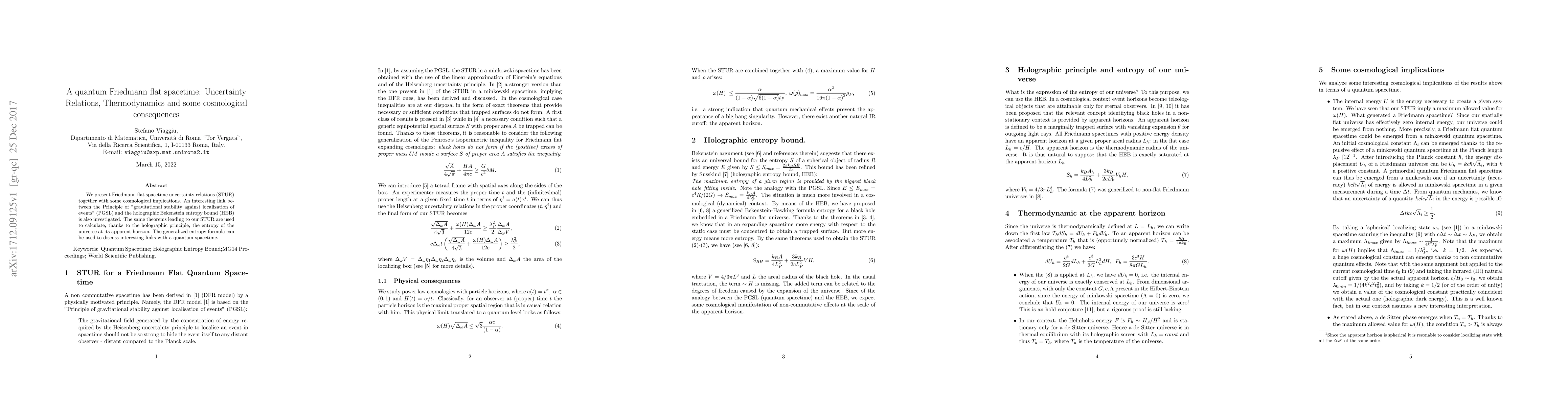 We present Friedmann flat spacetime uncertainty relations (STUR) together with some cosmological implications. An interesting link between the Principle of "gravitational stability against localization of events" (PGSL) and the holographic Bekenstein entropy bound (HEB) is also investigated. The same theorems leading to our STUR are used to calculate, thanks to the holographic principle, the entropy of the universe at its apparent horizon. The generalized entropy formula can be used to discuss interesting links with a quantum spacetime.