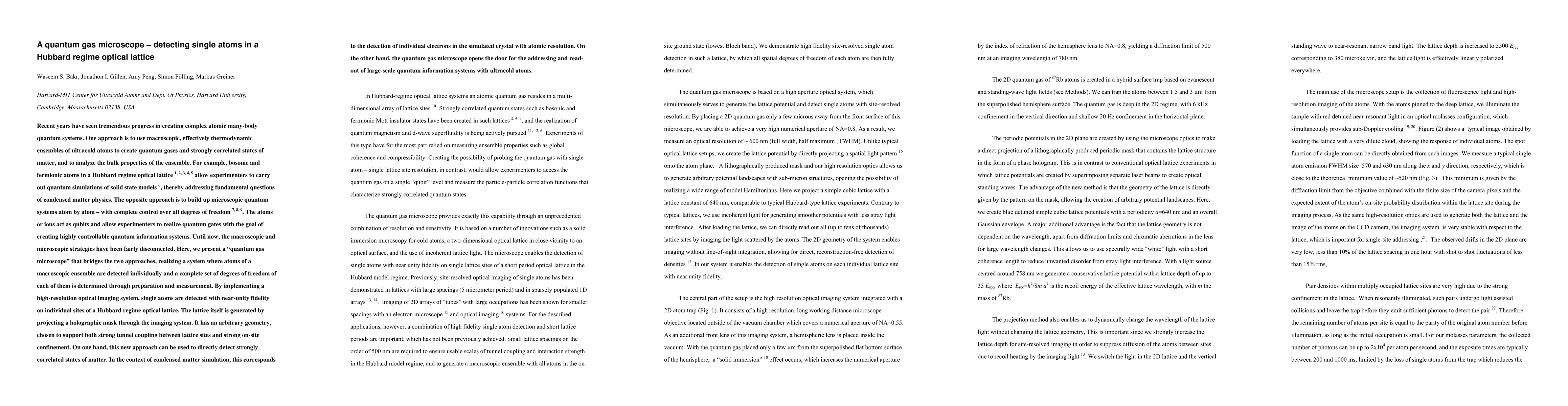 The paper introduces a quantum gas microscope that bridges macroscopic and microscopic quantum systems by detecting single atoms in a Hubbard regime optical lattice with high-resolution imaging, enabling the study of strongly correlated states and large-scale quantum information systems.