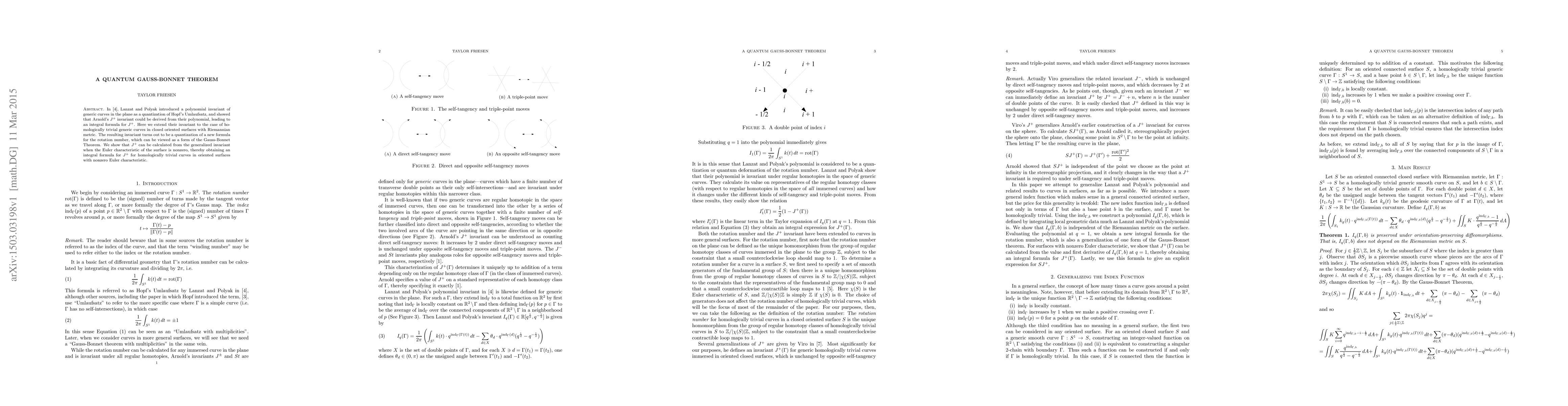In their paper "Integrating curvature: From Umlaufsatz to J+ invariant" Lanzat and Polyak introduced a polynomial invariant of generic curves in the plane as a quantization of Hopf's Umlaufsatz, and showed that Arnold's J+ invariant could be derived from their polynomial, leading to an integral formula for J+. Here we extend their invariant to the case of homologically trivial generic curves in closed oriented surfaces with Riemannian metric. The resulting invariant turns out to be a quantization of a new formula for the rotation number, which can be viewed as a form of the Gauss-Bonnet Theorem. We show that J+ can be calculated from the generalized invariant when the Euler characteristic of the surface is nonzero, thereby obtaining an integral formula for J+ for homologically trivial curves in oriented surfaces with nonzero Euler characteristic.