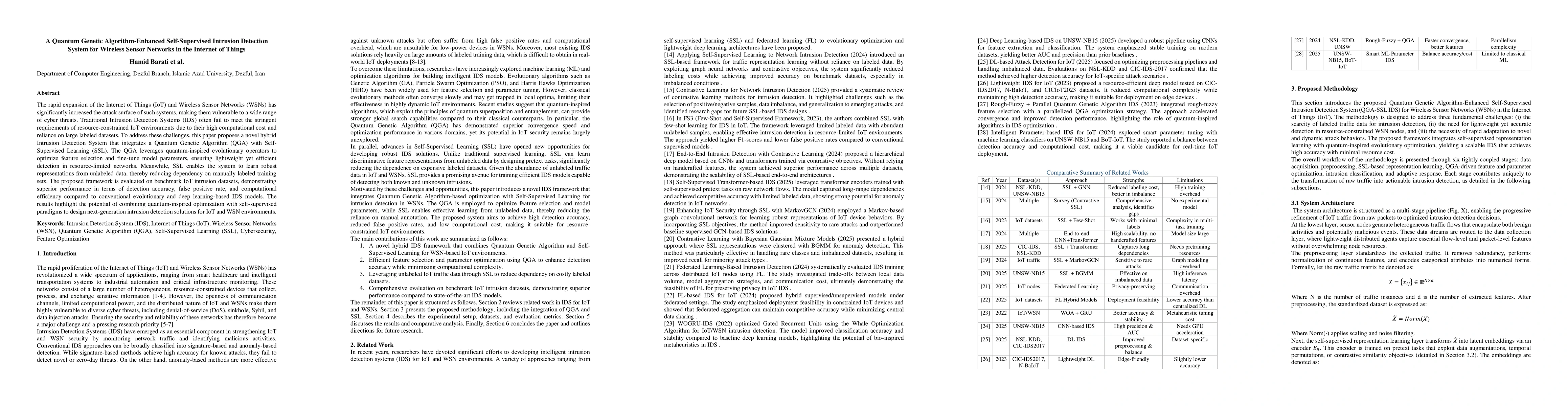 The rapid expansion of the Internet of Things (IoT) and Wireless Sensor Networks (WSNs) has significantly increased the attack surface of such systems, making them vulnerable to a wide range of cyber threats. Traditional Intrusion Detection Systems (IDS) often fail to meet the stringent requirements of resource-constrained IoT environments due to their high computational cost and reliance on large labeled datasets. To address these challenges, this paper proposes a novel hybrid Intrusion Detection System that integrates a Quantum Genetic Algorithm (QGA) with Self-Supervised Learning (SSL). The QGA leverages quantum-inspired evolutionary operators to optimize feature selection and fine-tune model parameters, ensuring lightweight yet efficient detection in resource-limited networks. Meanwhile, SSL enables the system to learn robust representations from unlabeled data, thereby reducing dependency on manually labeled training sets. The proposed framework is evaluated on benchmark IoT intrusion datasets, demonstrating superior performance in terms of detection accuracy, false positive rate, and computational efficiency compared to conventional evolutionary and deep learning-based IDS models. The results highlight the potential of combining quantum-inspired optimization with self-supervised paradigms to design next-generation intrusion detection solutions for IoT and WSN environments.