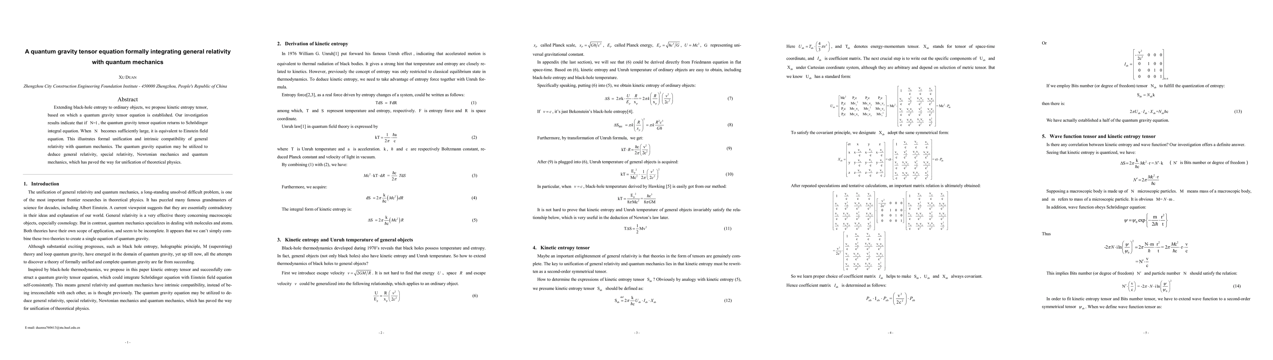Extending black-hole entropy to ordinary objects, we propose kinetic entropy tensor, based on which a quantum gravity tensor equation is established. Our investigation results indicate that if N=1, the quantum gravity tensor equation returns to Schrodinger integral equation. When N becomes sufficiently large, it is equivalent to Einstein field equation. This illustrates formal unification and intrinsic compatibility of general relativity with quantum mechanics. The quantum gravity equation may be utilized to deduce general relativity, special relativity, Newtonian mechanics and quantum mechanics, which has paved the way for unification of theoretical physics.