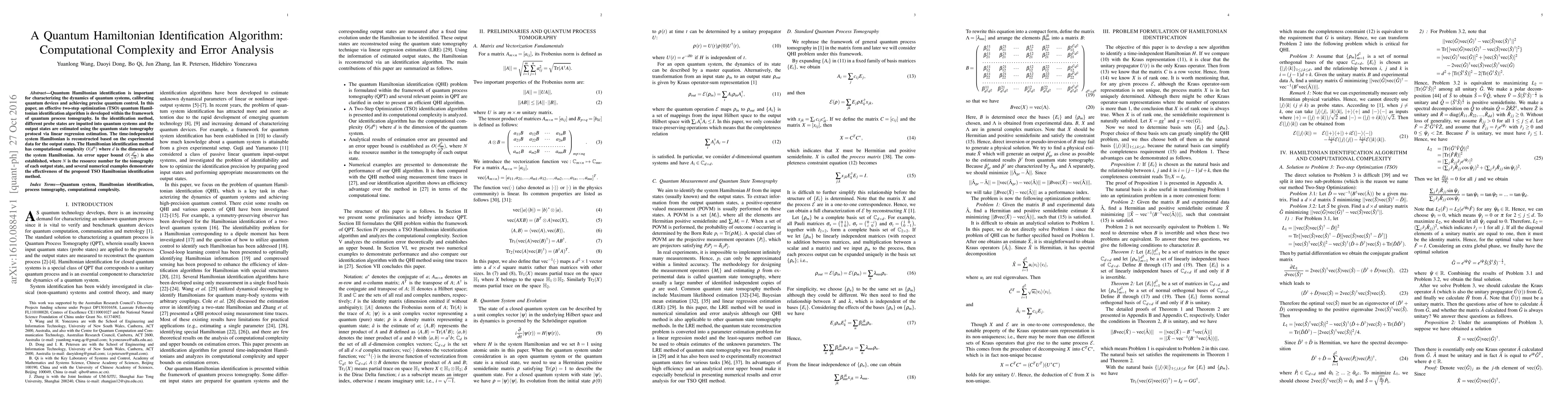 This paper introduces a two-step optimization algorithm for identifying quantum Hamiltonians using quantum process tomography. It reconstructs the Hamiltonian from experimental data, with a computational complexity of O(d^6) and an error bound of O(d^3/N^(1/2)), where d is the system dimension and N is the tomography resource number.