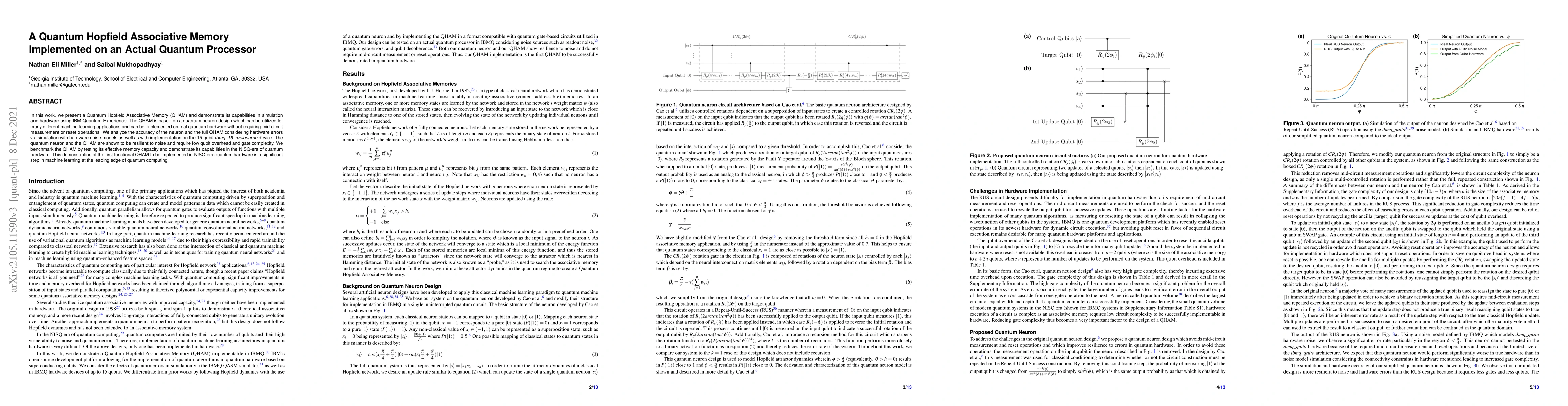 The research presents a Quantum Hopfield Associative Memory (QHAM) implemented on IBM Quantum Experience, utilizing a quantum neuron design resilient to noise and requiring low qubit overhead and gate complexity. The accuracy of the neuron and QHAM is analyzed via simulation with hardware noise models and actual implementation on the 15-qubit ibmq_16_melbourne device.