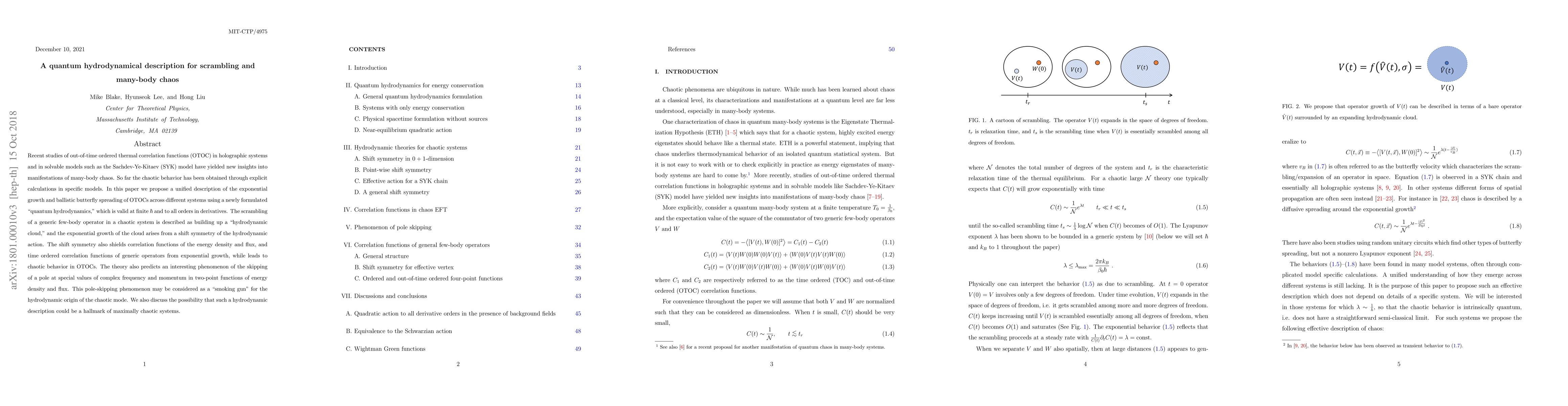 Recent studies of out-of-time ordered thermal correlation functions (OTOC) in holographic systems and in solvable models such as the Sachdev-Ye-Kitaev (SYK) model have yielded new insights into manifestations of many-body chaos. So far the chaotic behavior has been obtained through explicit calculations in specific models. In this paper we propose a unified description of the exponential growth and ballistic butterfly spreading of OTOCs across different systems using a newly formulated "quantum hydrodynamics," which is valid at finite $\hbar$ and to all orders in derivatives. The scrambling of a generic few-body operator in a chaotic system is described as building up a "hydrodynamic cloud," and the exponential growth of the cloud arises from a shift symmetry of the hydrodynamic action. The shift symmetry also shields correlation functions of the energy density and flux, and time ordered correlation functions of generic operators from exponential growth, while leads to chaotic behavior in OTOCs. The theory also predicts an interesting phenomenon of the skipping of a pole at special values of complex frequency and momentum in two-point functions of energy density and flux. This pole-skipping phenomenon may be considered as a "smoking gun" for the hydrodynamic origin of the chaotic mode. We also discuss the possibility that such a hydrodynamic description could be a hallmark of maximally chaotic systems.