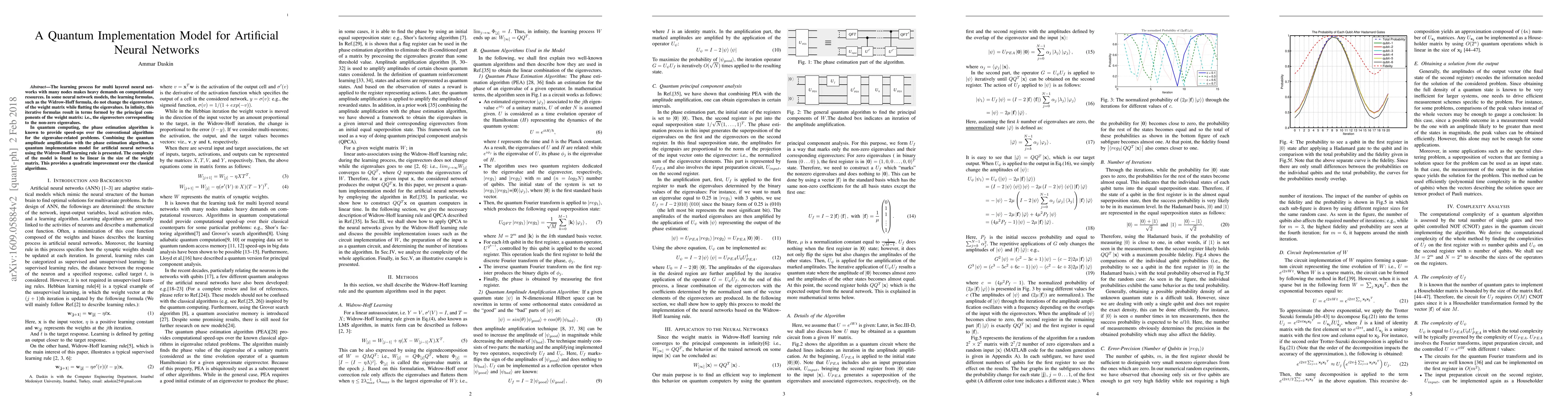 The learning process for multi layered neural networks with many nodes makes heavy demands on computational resources. In some neural network models, the learning formulas, such as the Widrow-Hoff formula, do not change the eigenvectors of the weight matrix while flatting the eigenvalues. In infinity, this iterative formulas result in terms formed by the principal components of the weight matrix: i.e., the eigenvectors corresponding to the non-zero eigenvalues. In quantum computing, the phase estimation algorithm is known to provide speed-ups over the conventional algorithms for the eigenvalue-related problems. Combining the quantum amplitude amplification with the phase estimation algorithm, a quantum implementation model for artificial neural networks using the Widrow-Hoff learning rule is presented. The complexity of the model is found to be linear in the size of the weight matrix. This provides a quadratic improvement over the classical algorithms.