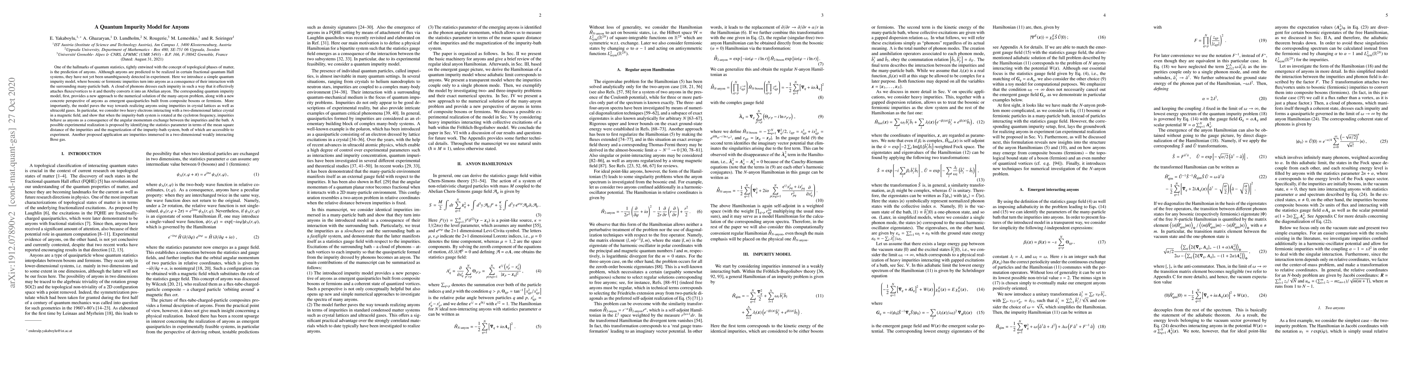 One of the hallmarks of quantum statistics, tightly entwined with the concept of topological phases of matter, is the prediction of anyons. Although anyons are predicted to be realized in certain fractional quantum Hall systems, they have not yet been unambiguously detected in experiment. Here we introduce a simple quantum impurity model, where bosonic or fermionic impurities turn into anyons as a consequence of their interaction with the surrounding many-particle bath. A cloud of phonons dresses each impurity in such a way that it effectively attaches fluxes/vortices to it and thereby converts it into an Abelian anyon. The corresponding quantum impurity model, first, provides a new approach to the numerical solution of the many-anyon problem, along with a new concrete perspective of anyons as emergent quasiparticles built from composite bosons or fermions. More importantly, the model paves the way towards realizing anyons using impurities in crystal lattices as well as ultracold gases. In particular, we consider two heavy electrons interacting with a two-dimensional lattice crystal in a magnetic field, and show that when the impurity-bath system is rotated at the cyclotron frequency, impurities behave as anyons as a consequence of the angular momentum exchange between the impurities and the bath. A possible experimental realization is proposed by identifying the statistics parameter in terms of the mean square distance of the impurities and the magnetization of the impurity-bath system, both of which are accessible to experiment. Another proposed application are impurities immersed in a two-dimensional weakly interacting Bose gas.