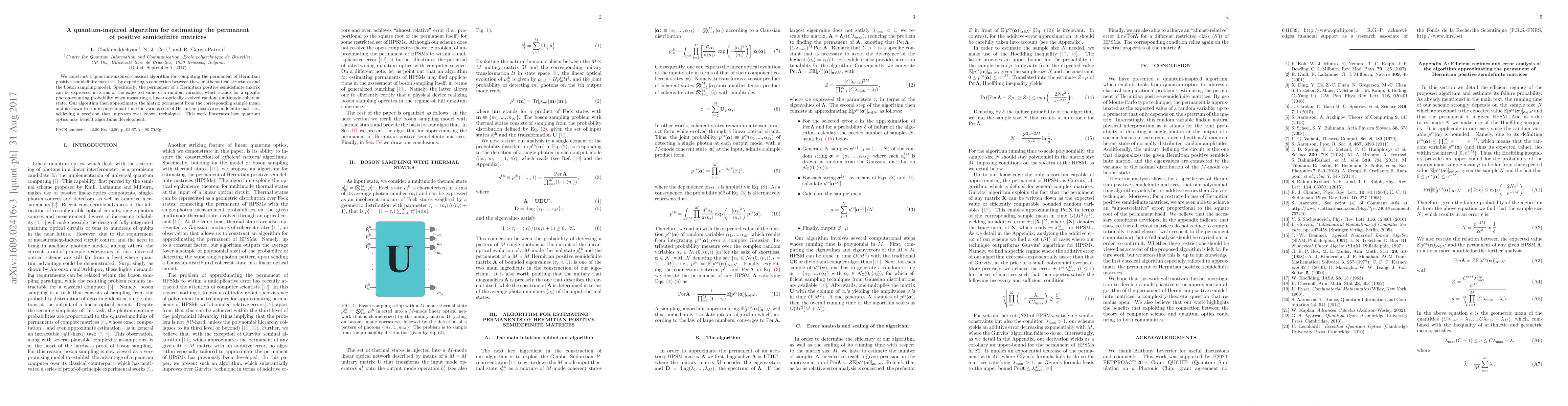 We construct a quantum-inspired classical algorithm for computing the permanent of Hermitian positive semidefinite matrices, by exploiting a connection between these mathematical structures and the boson sampling model. Specifically, the permanent of a Hermitian positive semidefinite matrix can be expressed in terms of the expected value of a random variable, which stands for a specific photon-counting probability when measuring a linear-optically evolved random multimode coherent state. Our algorithm then approximates the matrix permanent from the corresponding sample mean and is shown to run in polynomial time for various sets of Hermitian positive semidefinite matrices, achieving a precision that improves over known techniques. This work illustrates how quantum optics may benefit algorithms development.