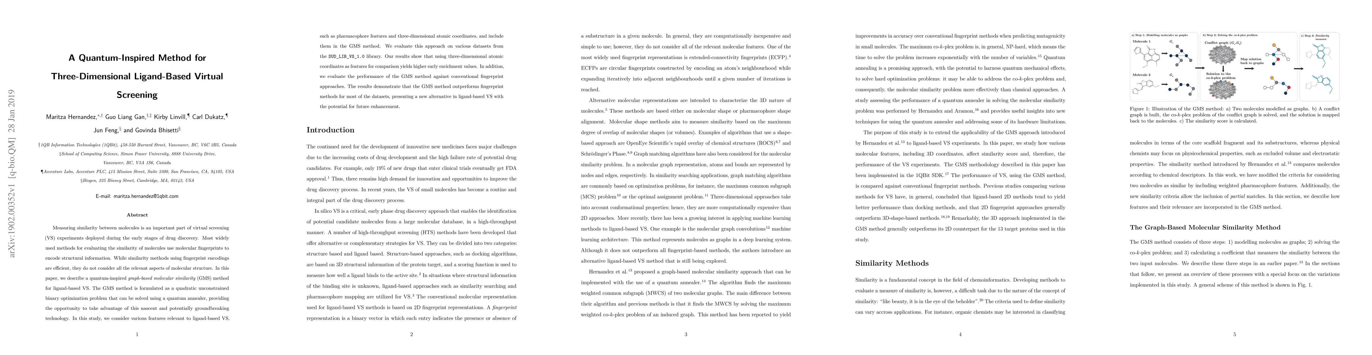 Measuring similarity between molecules is an important part of virtual screening (VS) experiments deployed during the early stages of drug discovery. Most widely used methods for evaluating the similarity of molecules use molecular fingerprints to encode structural information. While similarity methods using fingerprint encodings are efficient, they do not consider all the relevant aspects of molecular structure. In this paper, we describe a quantum-inspired graph-based molecular similarity (GMS) method for ligand-based VS. The GMS method is formulated as a quadratic unconstrained binary optimization problem that can be solved using a quantum annealer, providing the opportunity to take advantage of this nascent and potentially groundbreaking technology. In this study, we consider various features relevant to ligand-based VS, such as pharmacophore features and three-dimensional atomic coordinates, and include them in the GMS method. We evaluate this approach on various datasets from the DUD_LIB_VS_1.0 library. Our results show that using three-dimensional atomic coordinates as features for comparison yields higher early enrichment values. In addition, we evaluate the performance of the GMS method against conventional fingerprint approaches. The results demonstrate that the GMS method outperforms fingerprint methods for most of the datasets, presenting a new alternative in ligand-based VS with the potential for future enhancement.