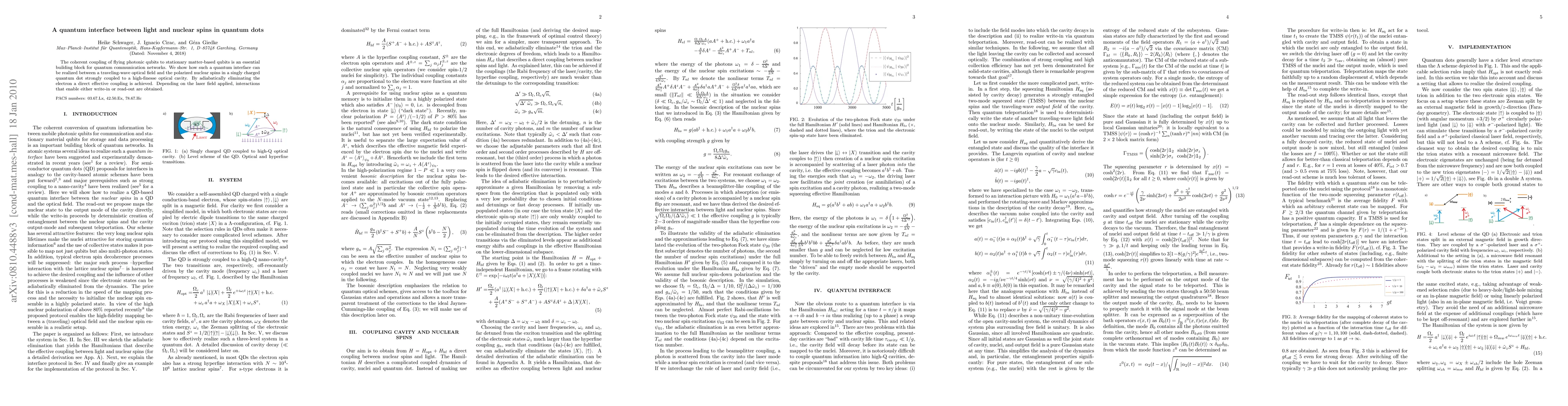This paper demonstrates a quantum interface linking traveling photonic qubits to nuclear spins in a quantum dot, achieved by strongly coupling the dot to an optical cavity and eliminating the electron to enable direct effective coupling. The setup allows for interactions that enable either writing to or reading from the nuclear spins based on the applied laser field.